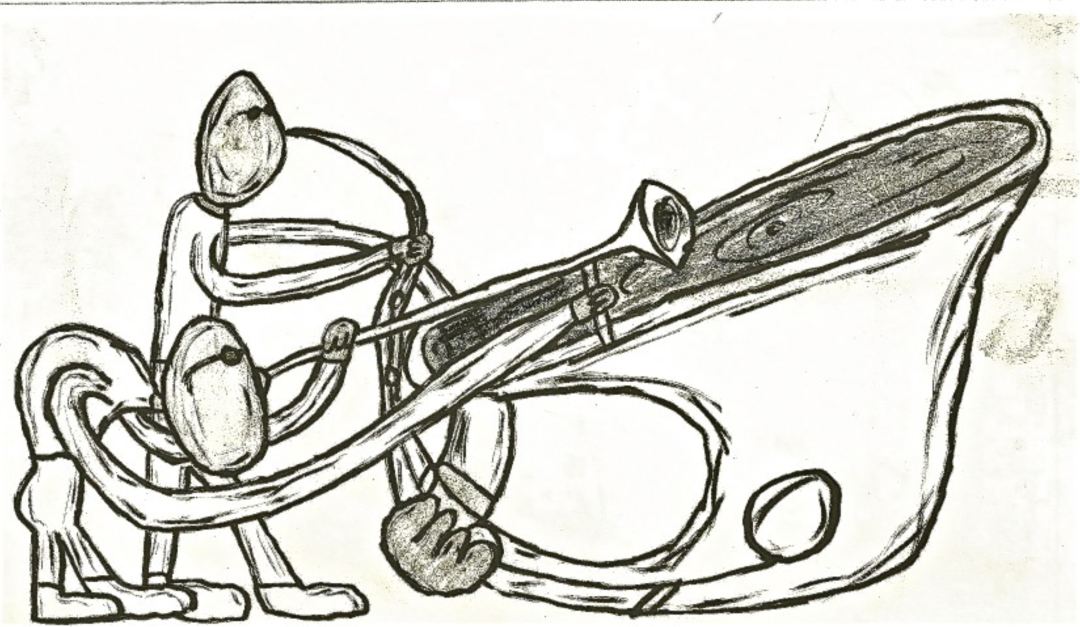 I seam to recall watching some old film with Louis Armstrong and the bloody VHS tape got stuck, overlapping the frames of the film and making Louis look like he was in close up and far away at the same time. After fixing the tape, that image stayed with me… the strangeness of the overlapped image and accompanying questions of what would the sound of been if it had overlapped as well. Would it remain a harmonized trumpet or be stretched out into a sharp sax note and down out trombone tone? I enjoyed letting this play in my head until I grabbed my sketchbook and produced this image. I still want to make this one into a painting… I think it would be awesome on a large canvas at least 10 feet long, what do you think?