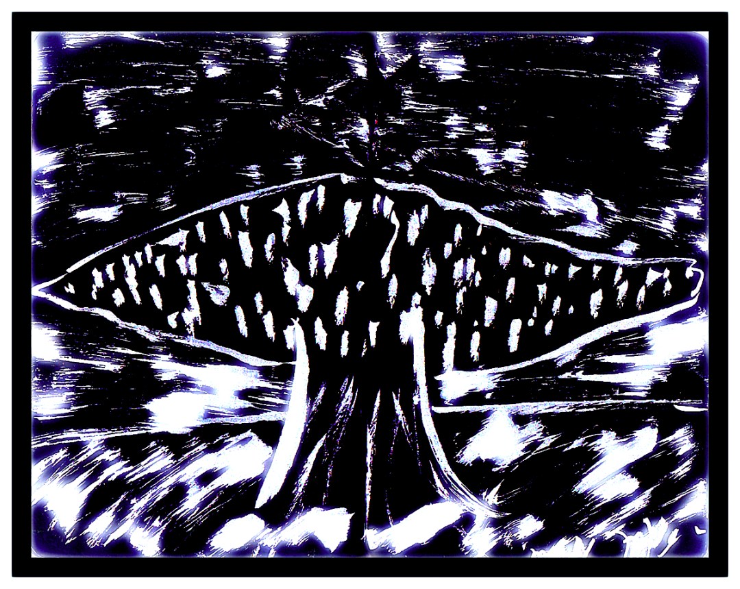 The drawing was done from play with the brush tip marker, from bold to fine detail, playing with a dry-brushing technique… the photo-manipulation consists of enhancing the details and sharpness to the max, using a vignette function to darken the corners, then doing some fine-cropping and framing to imitate a comic strip cell appearance. Finishing with putting the image through a series of negative or reverse exposures until I got the stained glass feel I wanted.