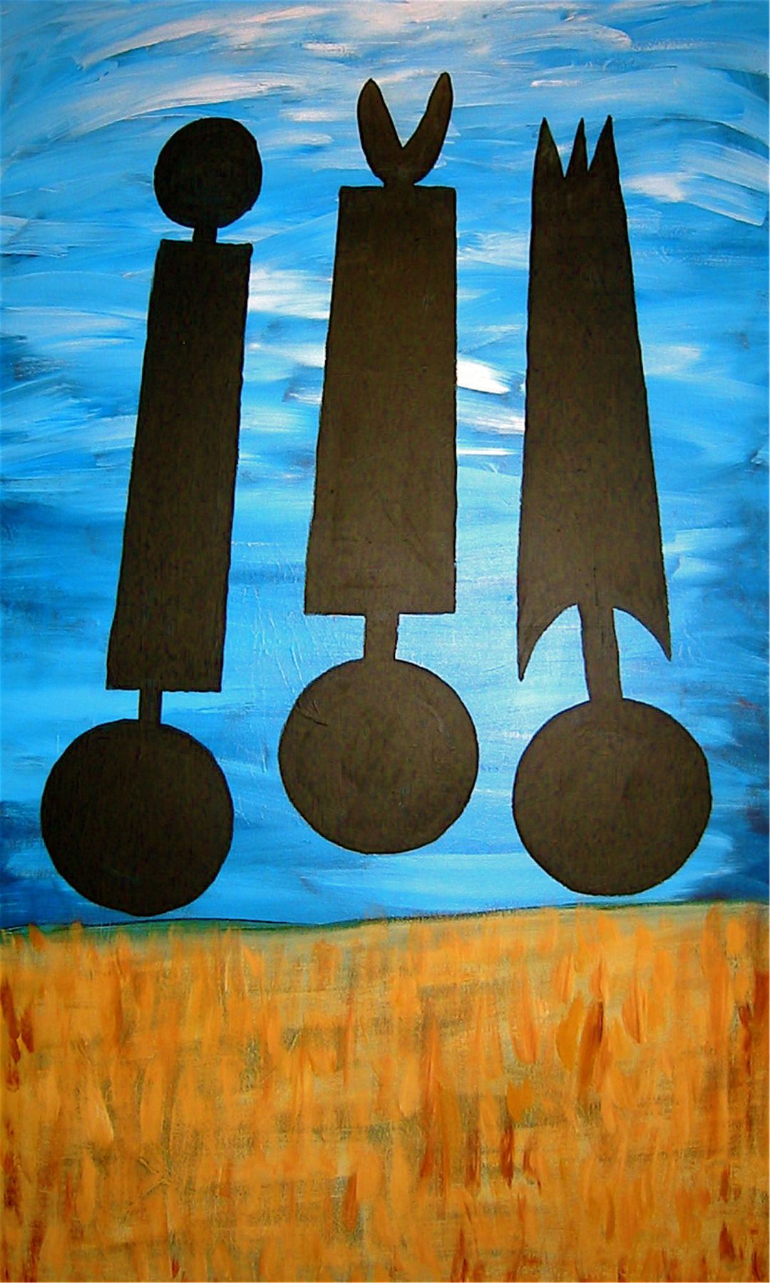 I was studying African masks and wall art at the same time as I was immersing myself in science fiction books and films… this odd image stayed on my easel for a long time… until I found the silhouettes of theses tribal masks… the description of the ceremony in which they were used was intense and deeply spiritual… they are silhouettes, because each participant of the ceremony is meant to see something different… come spirit walk with me in this painting and tell me what you see.