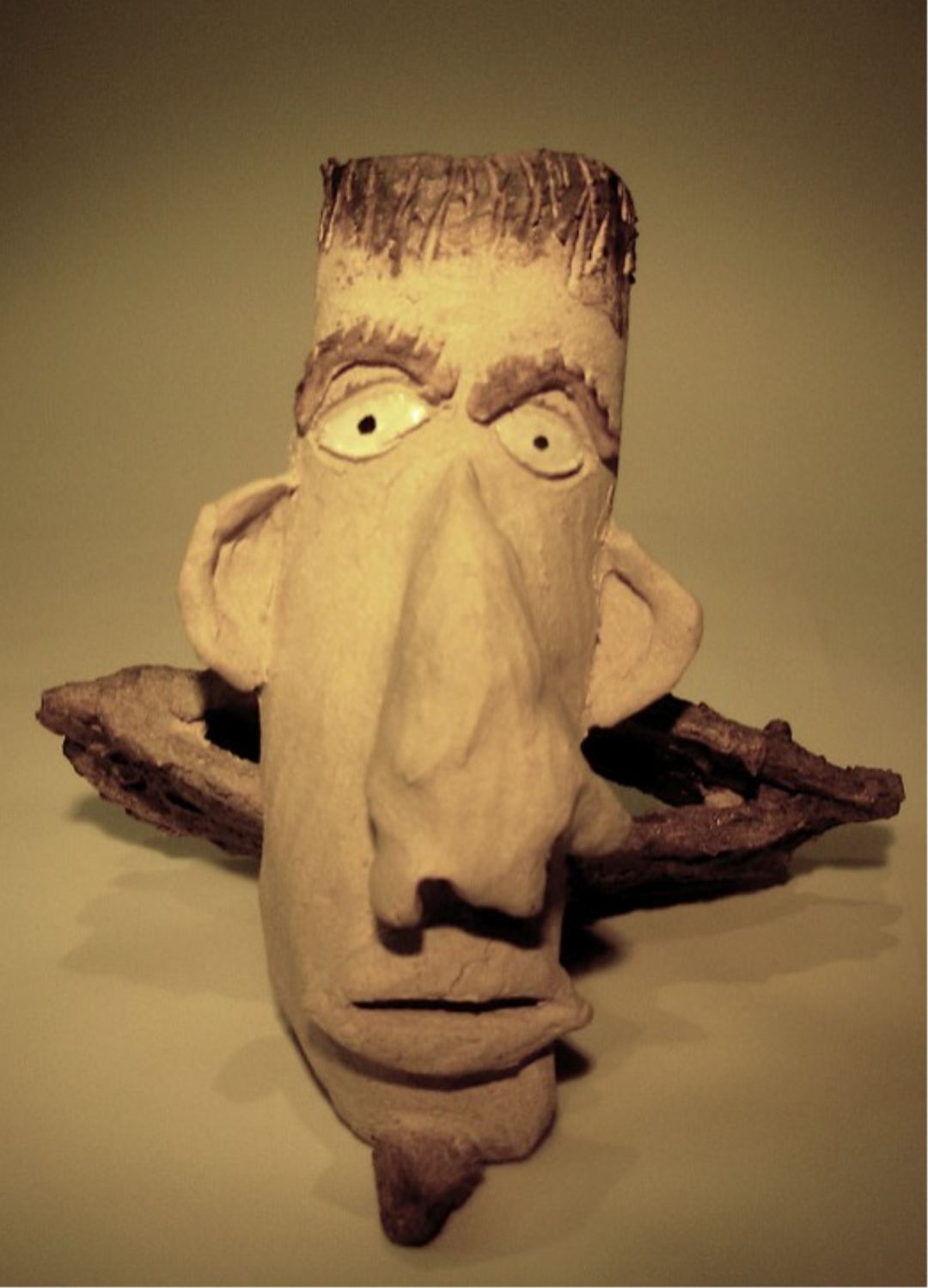 Using a Cone 6 stoneware, I rolled out slabs first. When wet leather hard, I cut and formed the cone, the eyebrows, nose, goatee, and base. Before the assembly, the pieces were placed all together under a sheet of dry-cleaners plastic to all dry very slowly and be at the same hardness for assembly. A few days later, I removed the plastic and assembled the parts together, by scoring the clay and using a little slip to glue the parts together. I let it sit for about an hour, then using different wood tools, I added textures & scorings to the surface. For the base, I sponged on more slip to give it a mossy rock feel. I let it sit for another hour uncovered before it was covered with damp newspaper for a week to allow it to dry slowly.