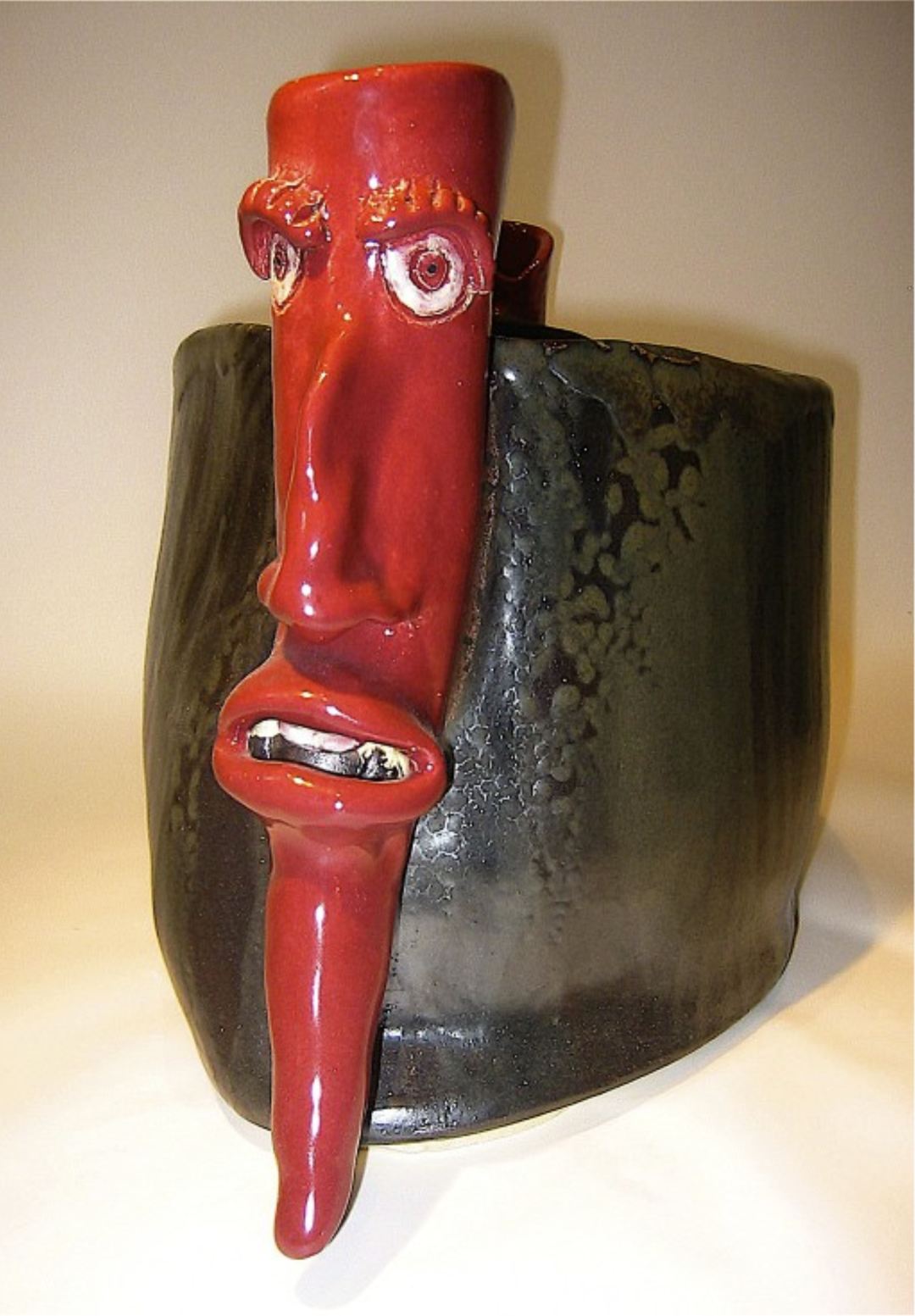My confidence was building fast and the desire to make larger pieces grew with it. I had made many pots already and started to explore working with just rolled, wet clay. I was still uncertain how so much weight in wet clay would react or how to assemble it nicely and solidly. One of my early patrons expressed an interest in having a vessel that incorporated my long faces, and this idea to use the faces as carrying handles came to me.