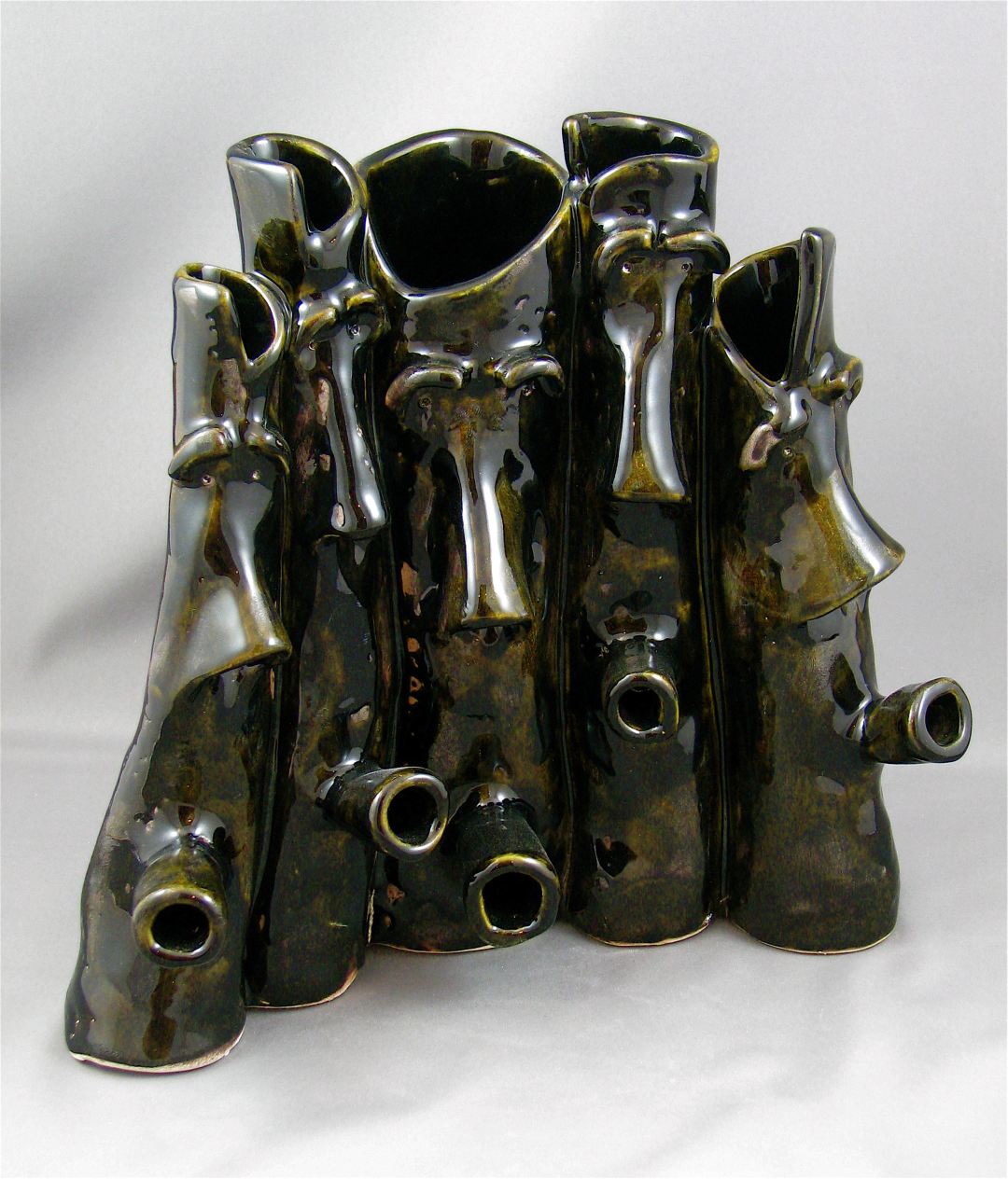 My fellow potter, Agnes Strauss was working on a recreation of what looked like a sea anemone, and it was a connecting of many clay tubes. This idea ran through my head for quite some time, until the challenge to make my long faces bigger and more functional.