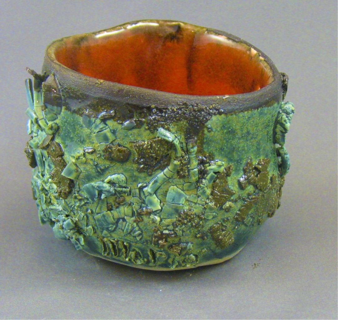 Miscellaneous: I also mixed into my glazes and onto the surface of my clays, asphalt, beach sand, glass beads & marbles, gold, silver, & copper wire, and a variety of metal dust. Some came from pottery supply houses, some from hardware stores, some simply found.