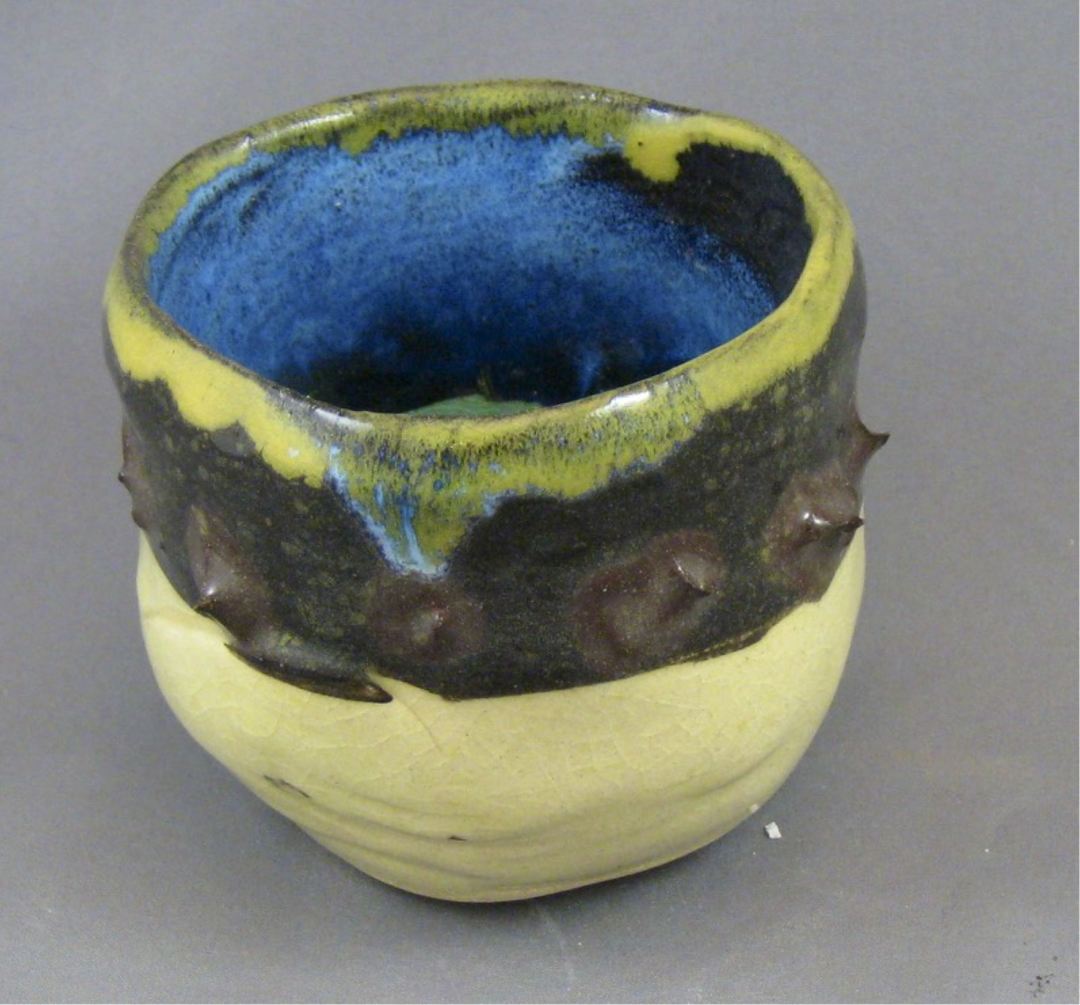“Raku ware (楽焼 raku-yaki) is a type of Japanese pottery traditionally used in Japanese tea ceremonies, most often in the form of chawan tea bowls. It is traditionally characterized by being hand-shaped rather than thrown; fairly porous vessels, which result from low firing temperatures; lead glazes, and the removal of pieces from the kiln while still glowing hot. In the traditional Japanese process, the fired raku piece is removed from the hot kiln and is allowed to cool in the open air. The familiar technique of placing the ware in a container filled with combustible material is not a traditional Raku practice. Raku techniques have been modified by contemporary potters worldwide.”