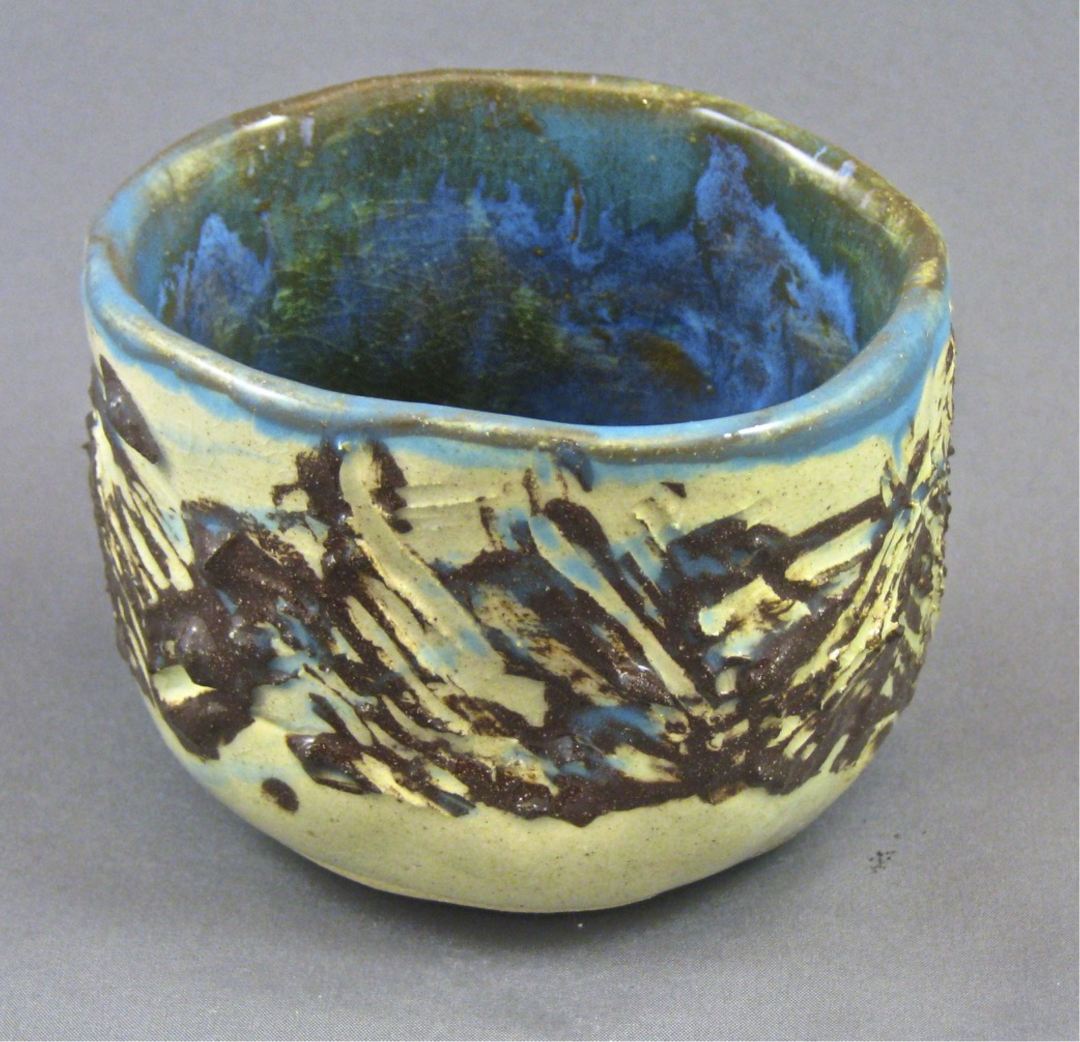 Combining a slab-building and Pinch-pot method to make the actual bowl, I worked it wet and fast. While still wet, I scored the outside with a fork and dabbed on some grog mixed with brown stain, then I set it aside to dry slowly under paper and plastic, before sending it to be bisqued.