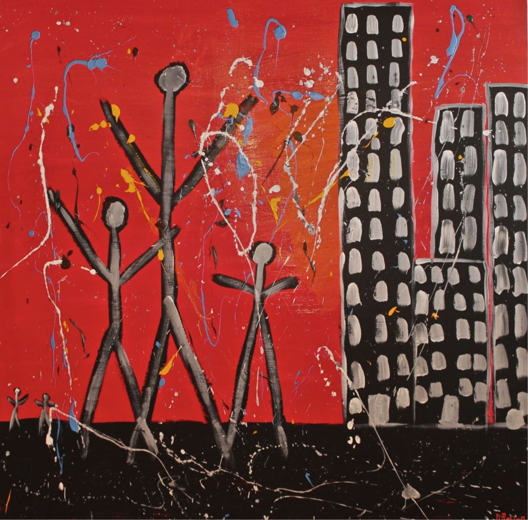 There’s a great deal of spontaneity in these paintings and that was enhanced by the bliss of working on such a large surface. While the red background adds the undertone of doom I wanted to achieve, there is an unmistakable festive mood in the stance of the street dancers.