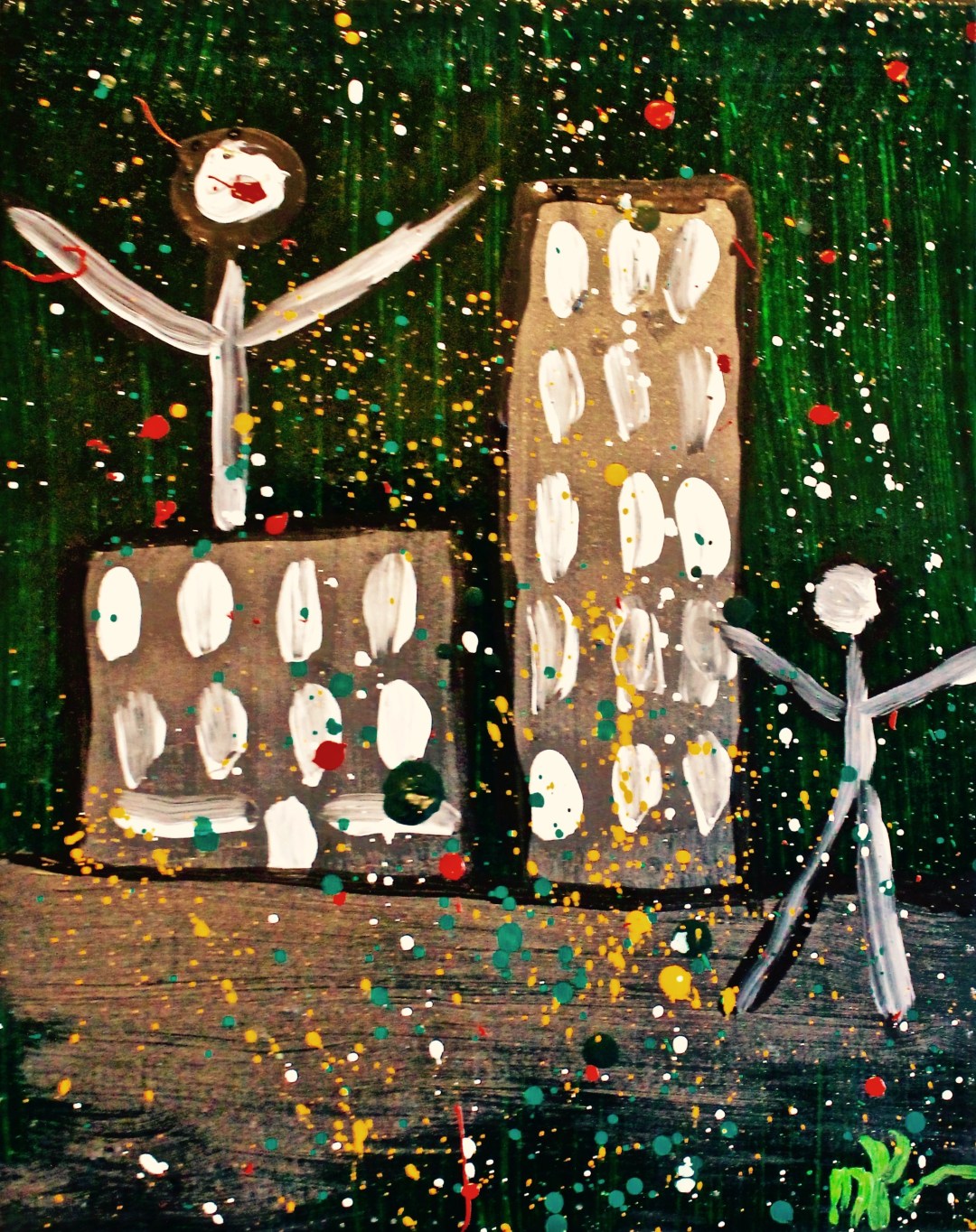 While my usual practice is to draw outlines and then paint in, either by building thin collar layers or thick areas, this time I started with painting the background followed by adding the buildings and figures, then covering the whole thing in a few coats of clear varnish. Followed by any highlights and shading, and splattering paint over it. The contrast of glossy background and matte textures added the depth I wanted and added to the ominous mood of the whole composition.