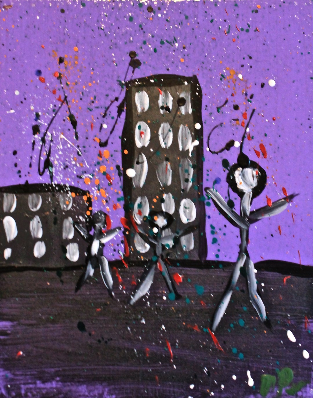 While my usual practice is to draw outlines and then paint in, either by building thin collar layers or thick areas, this time I started with painting the background followed by adding the buildings and figures, then covering the whole thing in a few coats of clear varnish. Followed by any highlights and shading, and splattering paint over it. The contrast of glossy background and matte textures added the depth I wanted and added to the ominous mood of the whole composition.
