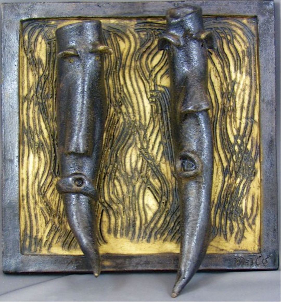 Roll your slab to about a quarter inch and cut the tile to the size desired. Cut the frame strips, about half an inch wide, and attach them to the tile by scoring and slip. This frame will solidify the tile and help prevent it from waring during drying and firing. Cut two strips about three-quarter inches wide by five inches long, curve them an inch from each end, to look like wide “U” shapes. Punch a small hole through the curved ends on one of the “U”s so you can use wire or leather rope to hand the tile when fired. Do not attach the “U”s yet.