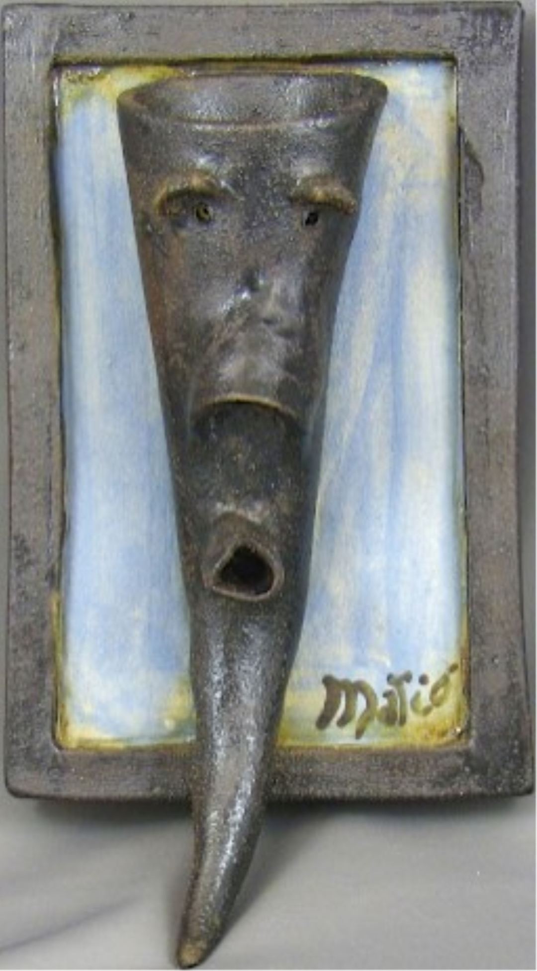 It’s important to say that this was intended as an experiment in adding colors to the tile and to date, it has not photographed as well as it appears live. The face is a simpler expression, stained dark to contrast with the blue engobe painted on the tile. The result expresses a loneliness that I don’t see in most of my similar faces. This is a transition piece for me. I went further and deeper into an emotional expression with the use of glazes. This one remains a strange reminder for me of sadness during the journey to something else. A reminder that I still have to work on living in the moment and being grateful for now.