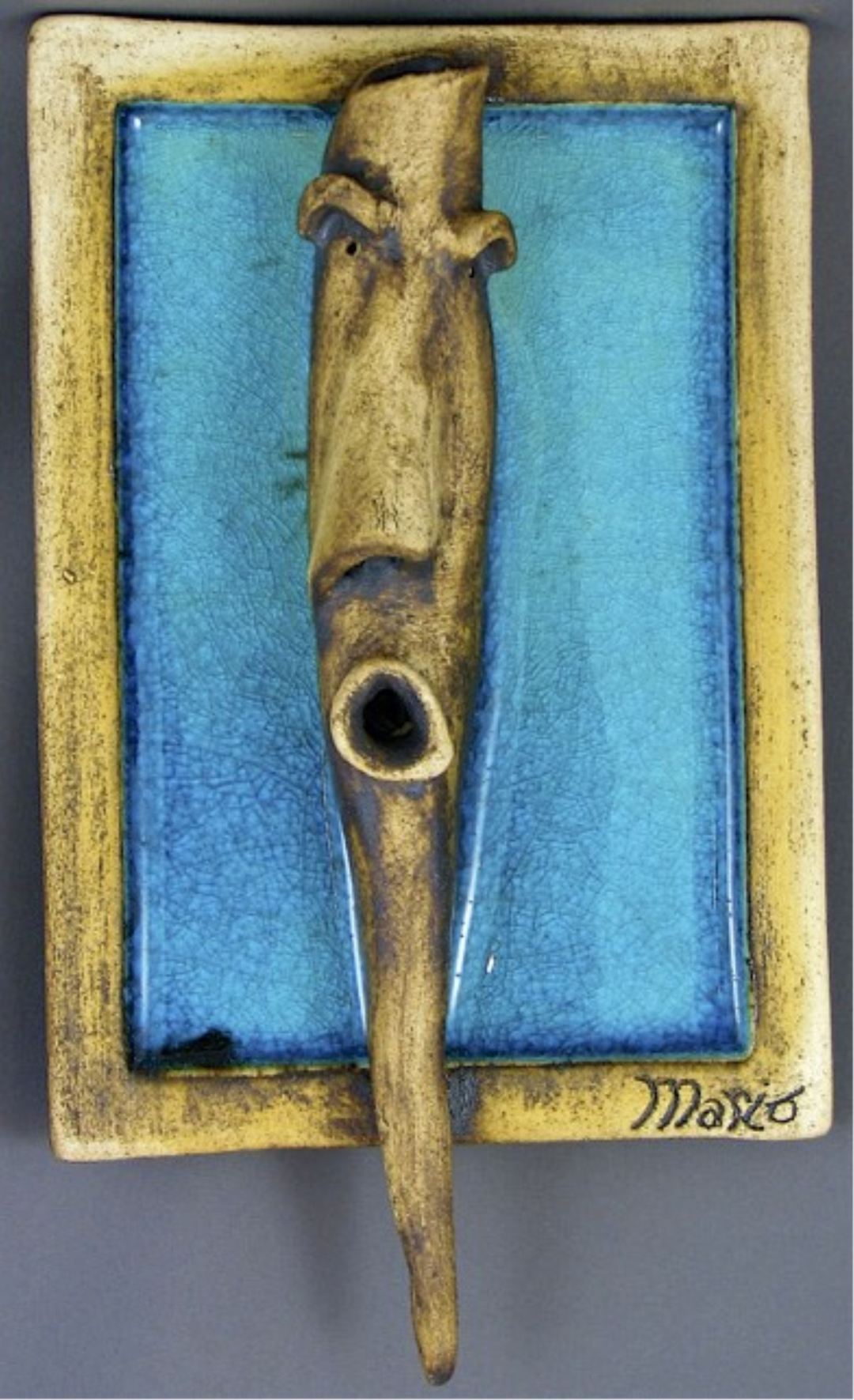 Roll your slab to about a quarter inch and cut the tile to the size desired. Cut the frame strips, about half an inch wide, and attach them to the tile by scoring and slip. This frame will solidify the tile and help prevent it from waring during drying and firing. Cut two strips about three-quarter inches wide by five inches long, curve them an inch from each end, to look like wide “U” shapes. Punch a small hole through the curved ends on one of the “U”s so you can use wire or leather rope to hand the tile when fired. Do not attach the “U”s yet.