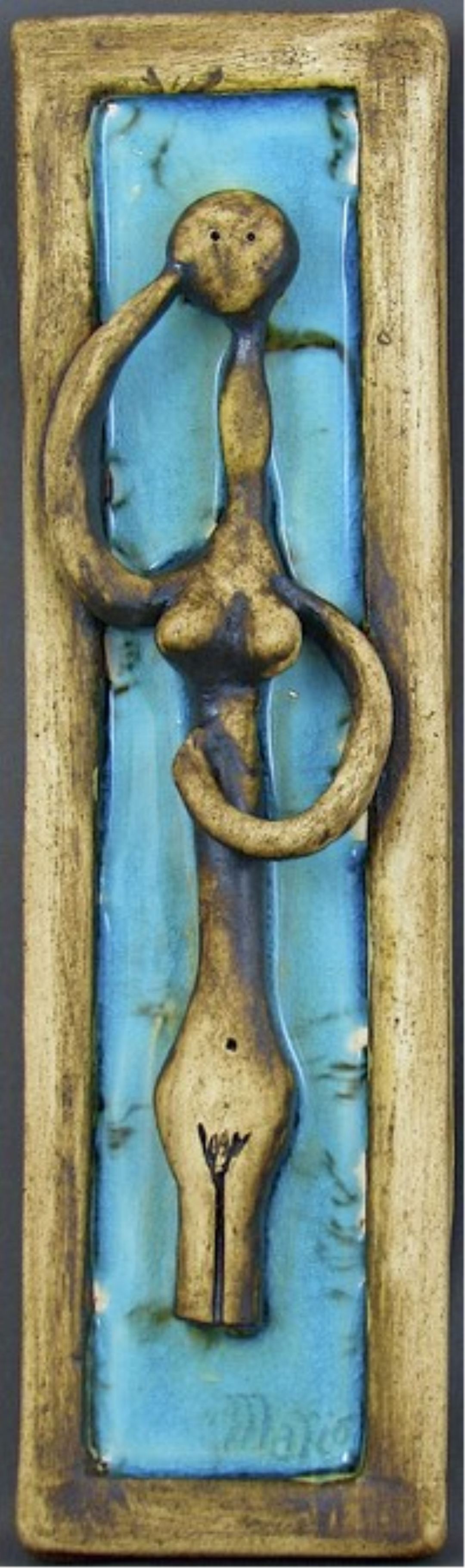 Another dancer seemingly stuck to a tile. She emotes a very different feeling; one of sadness and confusion. Perhaps I shouldn’t have fused her to the tile. Perhaps I should have put a thicker layer of glaze under her, so she could dance in the blue water and feel freer. The spirit mask covering her face feels equally expressing her emotions and those of the spirit of her mask. I wonder what her feelings would be outside the trance she dances in.