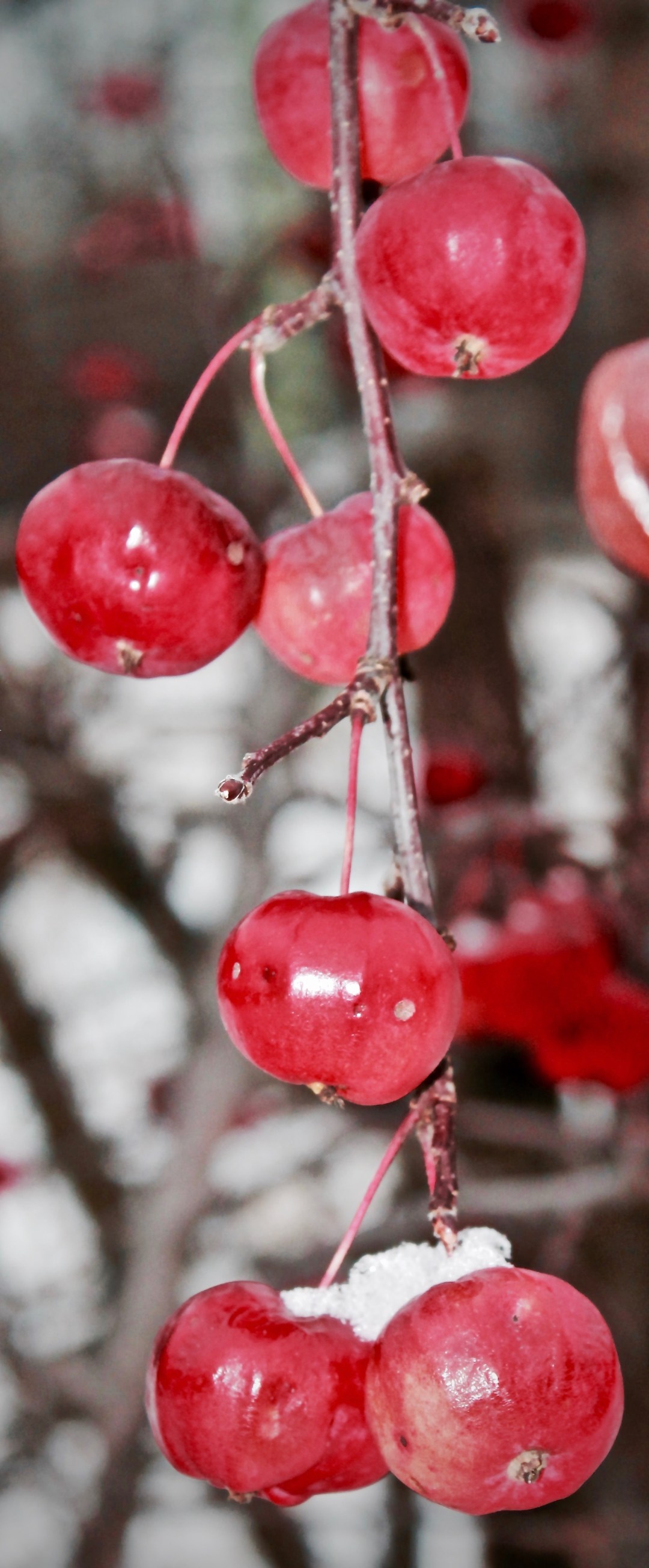 Please indulge my odd obsession with crabapples. I just had to take a macro on these to see what, if anything, was living on their skins. At minus 20 degrees Celsius, I can tell you there was nothing the naked eye could see. However, under the skin may have hidden something else. If you close at the fruit at the lowest right corner, you can imagine what I thought I saw. The skin was rippling as if something underneath still lived within the frozen fruit.