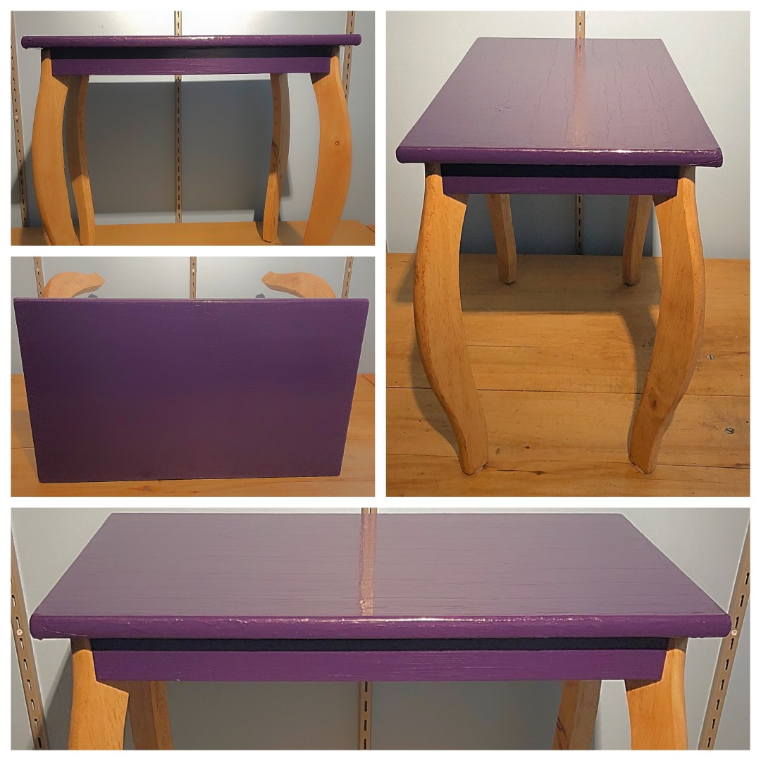 Then the unwanted happened and I knocked it off the table I was working on and caught it mid air, but not before a nice scuff ran across the surface. Well, my stream of expletives served only to relieve my own frustration and I was left with to do with the scuffed top. I painted another coat of the eggplant purple and prayed it would dry in the humidity. It did something unexpected. I should have expected it, as it is an effect I’ve used before on my paintings when working with acrylics. The latex based purple base, as it dried on top of the acrylic based varnish coat, started to crack ever so slightly and leaving a fabulous antique feel to the modern lined surface.