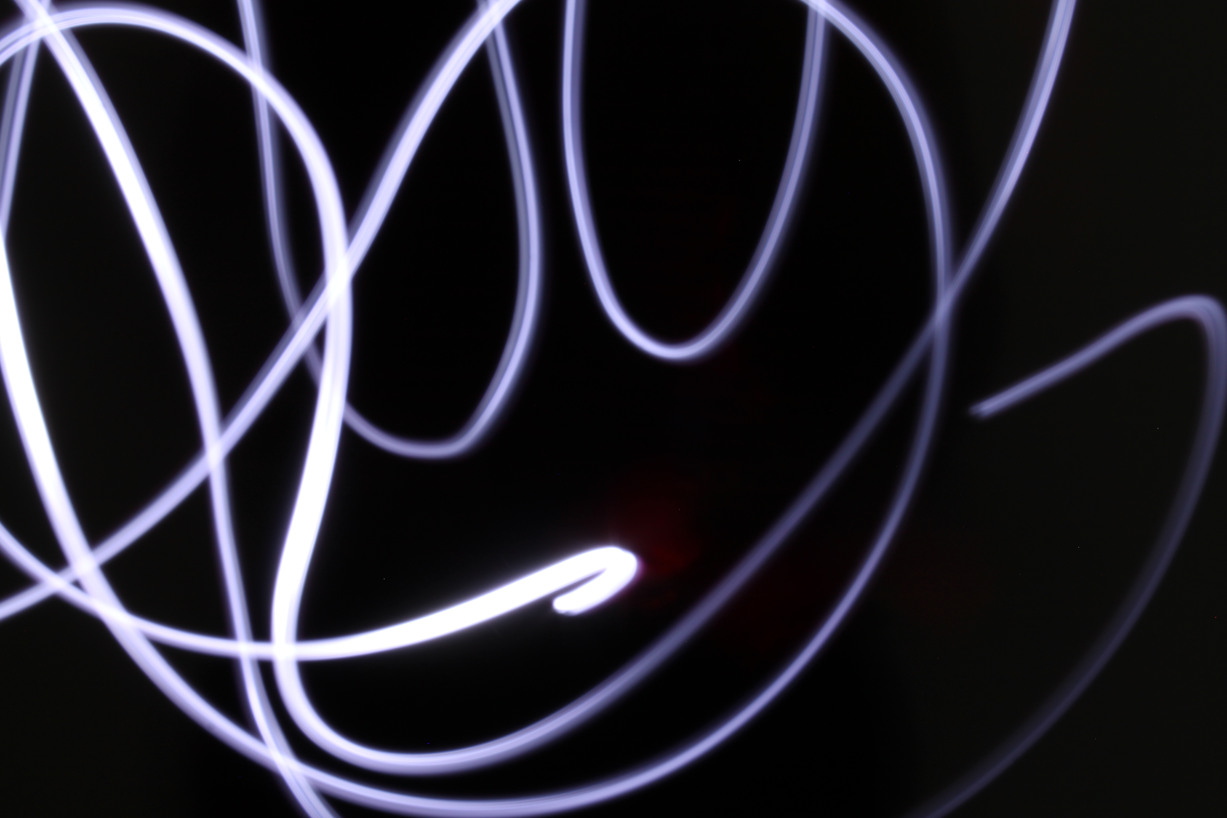 During our workshop: with white walls, low natural light; my camera settings were set-up with the aid of our T.A., Coleen. While my mind was on understanding the fluidity of light, I was very aware of my anxiety regarding the camera settings. We took over 40 spontaneous shots. The sharpest being when the light source was strong and pointed at the camera. It appeared that faster and more fluid movements gave us nice smooth lines. I couldn’t get my mind around how to actually draw with the light. This is a reflection on my need to understand technical things before finding any way to use them creatively. Because of time constraints, I let that go to have fun and see what happened.