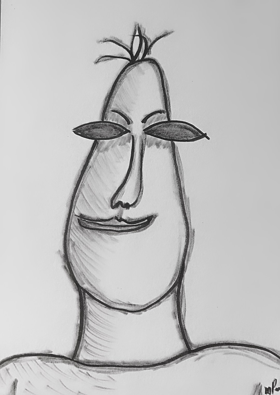 Look up “content” or “satisfied” in the dictionary and you probably won’t find this face, but maybe you will. I wasn’t sure if the eyes would look like granny glasses or alien eyes, but I just had to have them extend past the sides of the face. I pushed a softer nose and smiling mouth, not laughing just smiling. The composition felt like an expression of satisfaction. Not a mask of the feeling, like some of my faces, but a sincere expression of pride and I-did-it-ness. It made me happy too.