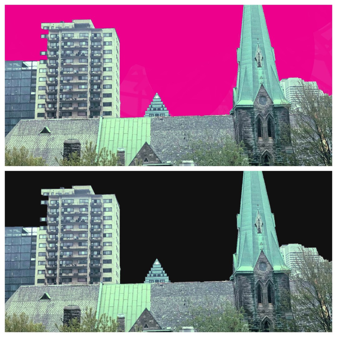 I see this view from the second floor windows at the EV building at Concordia university, facing Mackay Street. The view disturbs me and I’m not sure if it’s because it is remarkable or un remarkable. It just bugs me. I find myself taking the same picture of it from different floors, as if I will a some point find answers to this mystery. I think I will eventually. In the mean site, I keep playing with the different shots and found some amusement in these two. While playing with the skyline, I found that it felt Gothic and needed to be darker for the vampires in my imagination to emerge. The black sky was the closest, but the bright pink added a more cinematic flair to it. I’ll let you be the judge. I have a feeling I will be returning to this one, as I find the sky gives me a great canvas to add more stories to.
