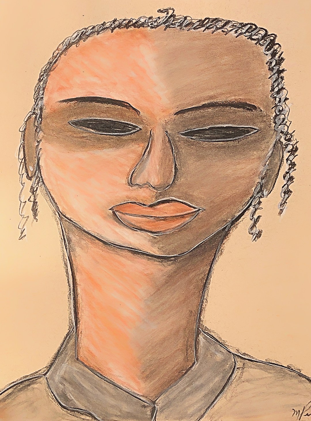 I’m on the fence about this one. While she seems to have a fixed thought in her mind, I get a sense that some uncertainty remains. Perhaps it comes from the loose use of coloured charcoals and how I rubbed them with a lighter touch than usual to get a grainier finish. In the photo editing process, I often sharpen the image a little to reveal more of the texture I get from my drawing media. This time it turned out looking more like a watercolour. For more of my drawings, visit Arts M.Perron