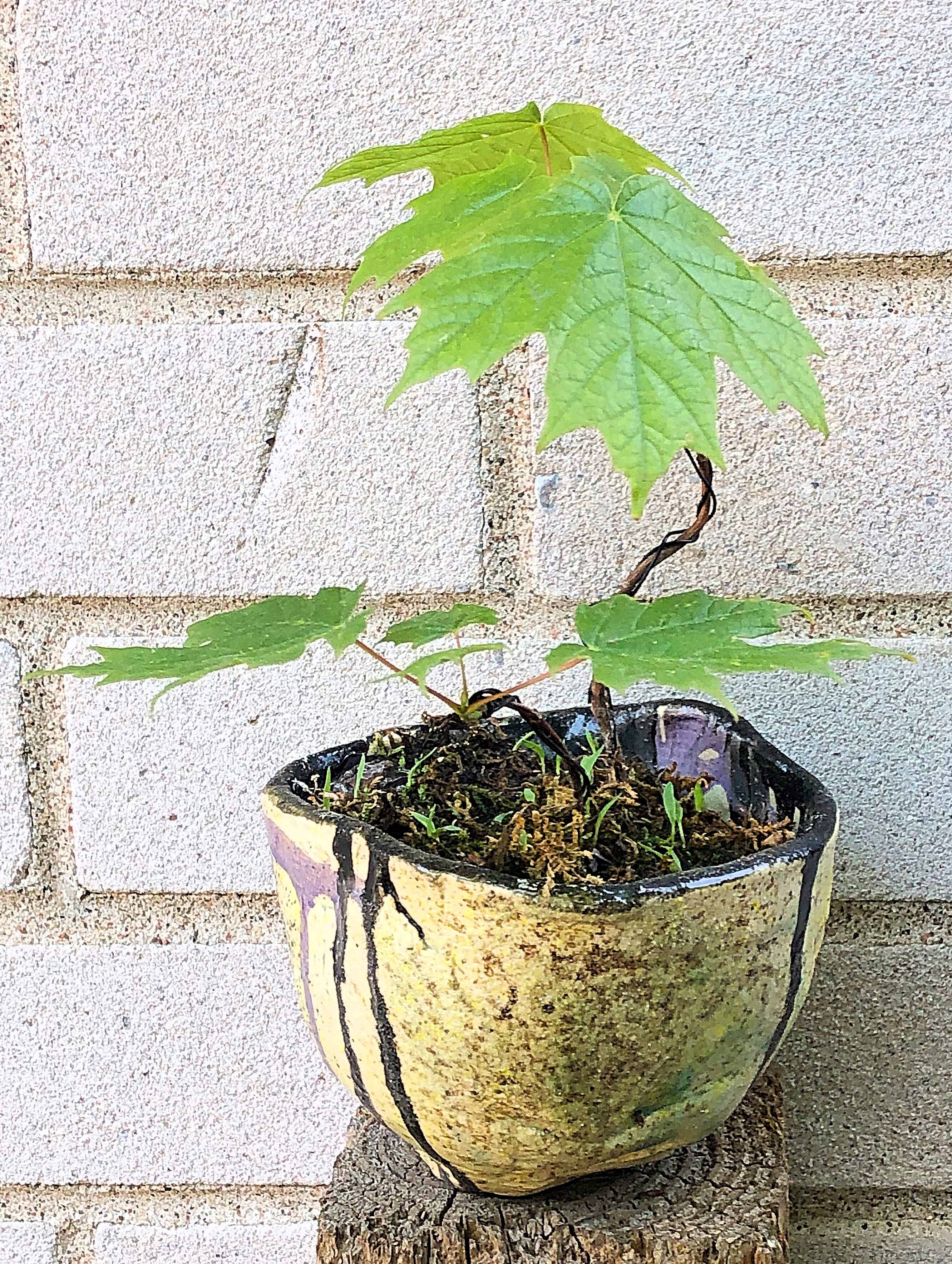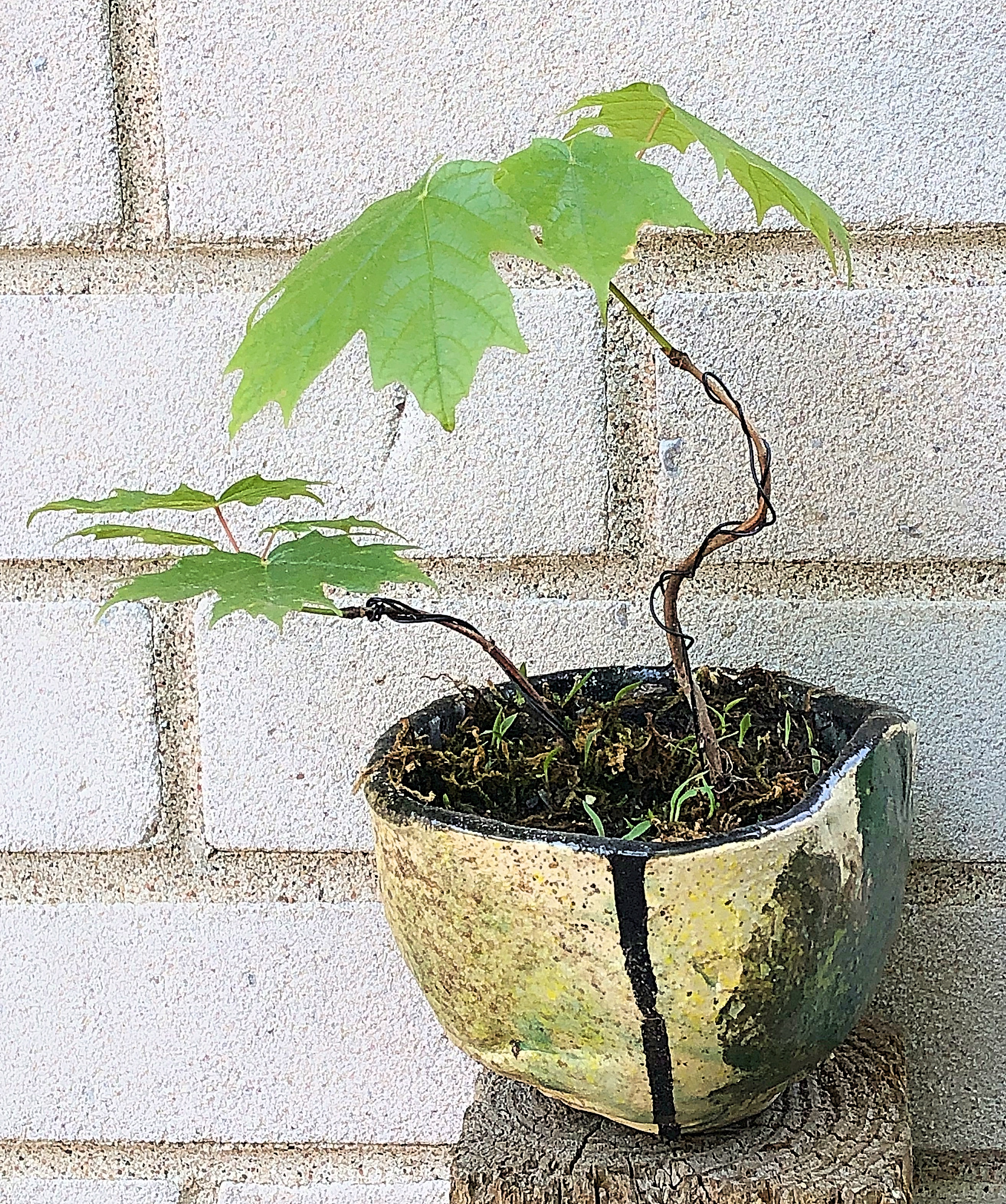 I have all these little maple trees growing all over my yard. At first I wasn’t sure what to do with them. Now I have a few ideas. Always fascinated with Bonsais, I thought I could possibly do my own with a Canadian twist. Taking some of my electric-fired, Raku-styled tea bowls and using them as pots just seemed to make sense, especially since I’ve been getting so many ideas from Pinterest to do just this.
