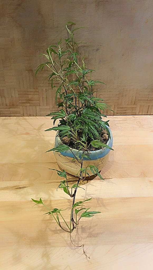 I wasn’t sure if I wanted to repurpose this small tea bowl. It was very nicely done, comfortable in the hand, and with a beautiful blue crackle glaze. This early pot got very close to some of the early Korean pots I was inspired by. When I added this little indoor hanging plant, I wasn’t sure how it would react, much less how it would grow. I thought it would hang down over the sides and cover the pot. Well, I was off the mark on that one. Wishing an hour of being transplanted, the plant raised its arms and seemed to grow before my eyes. It’s been happy there ever since.