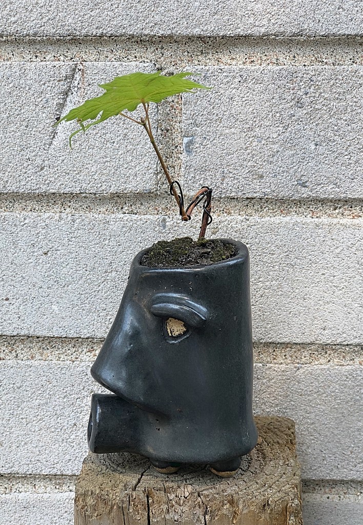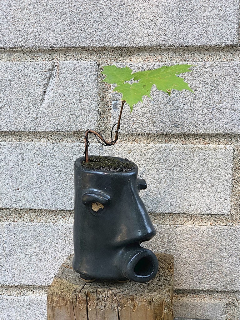 I found this tiny maple tree growing like a weed near my deck in the backyard. It hoped up from nowhere and seemed to have something important to say, but it had no voice. I still had one of hundreds of small shot classes I made a few years ago that felt like a perfect choice to give this little thinker his voice.