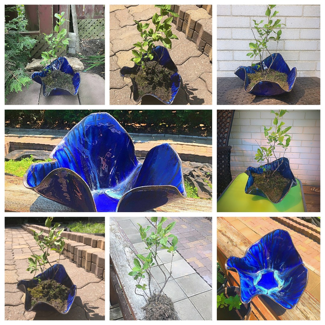 During my walk this morning, I deviated through a buggy and bushy field. I came across this tenacious little tree growing in a dry patch. It looked like an island of life in the sea of dead grass. They it hit me that it could be even more of an island. I decided to combine in with one of my ceramic bowls and continue my Transformations series. I cleaned off the roots and planted it in new earth with lots of water and some moss on top to retain the moisture.