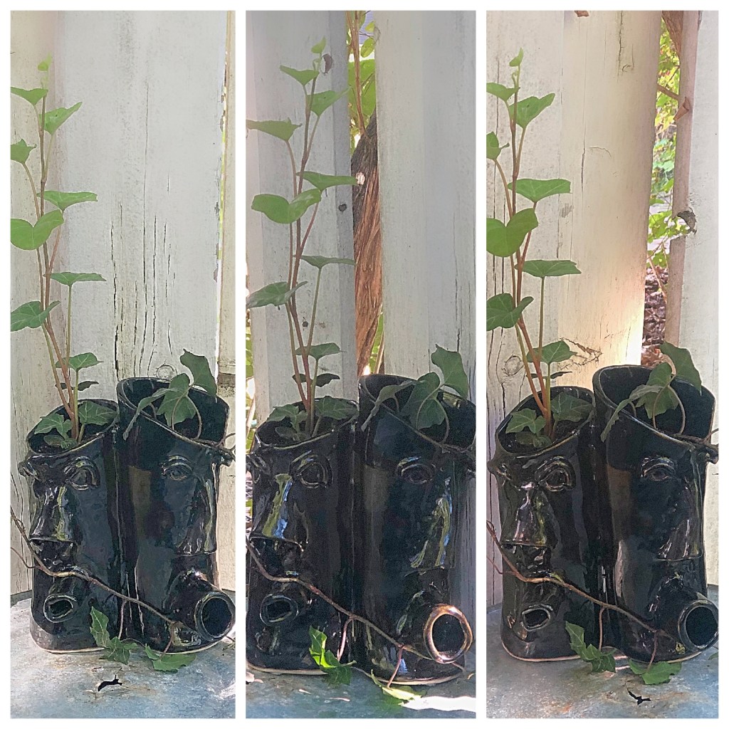 Here’s another never vase I made in my last firing many years ago that went right into storage, because of a move. It is one of very few pieces I made with a hand-made glossy black glaze on a stoneware body.
