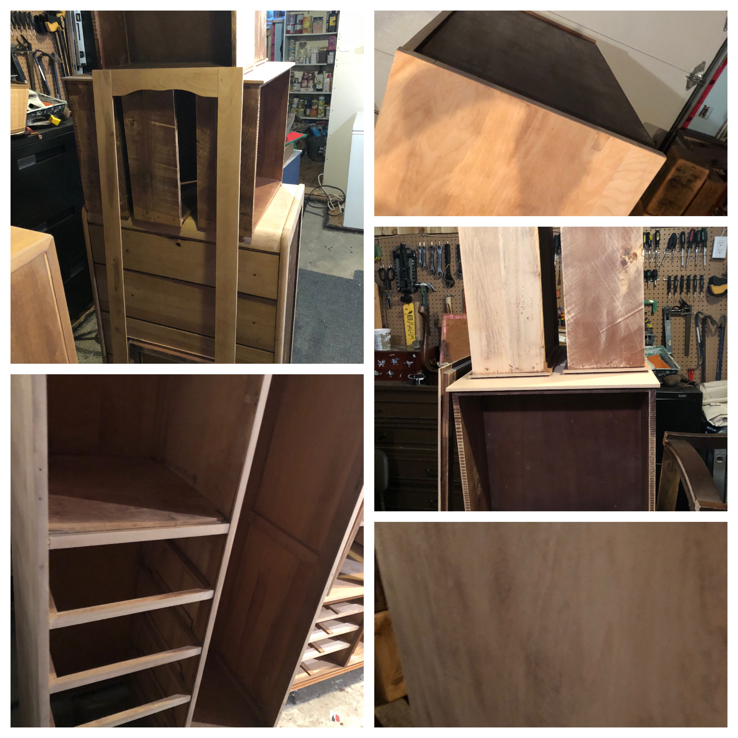 It was in a pitiful state and I di in fact take pity on it. I dragged it home in a wheelbarrow, with the help if my wife and daughter. We set it down in the driveway and I quickly dove into it. First taking it apart and gently shooing out the wildlife that infested it, then carefully disinfecting it with very hot vinegar water. I sat to dry for a few days in my garage, before I sanded away the warn and gummy layers of shellac. Then it sat in the garage amidst a load of other projects until this Spring.