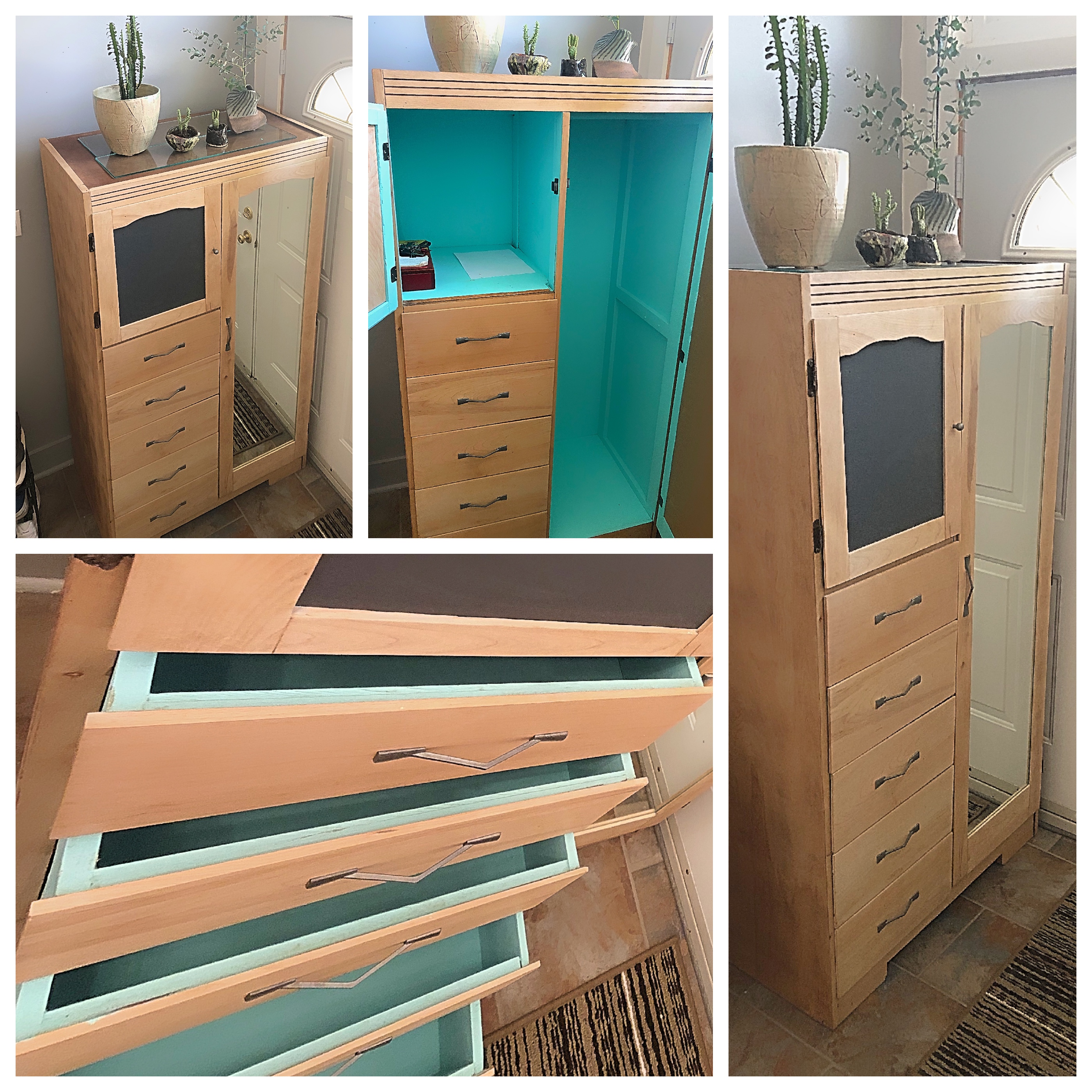 I brought into the house and painted the inside with turquoise chalk paint and went hunting for new handles. A much harder hunt than I expected. So, I used some cool hammered pewter spray paint to transform the handles and knob. I reassembles the whole thing in my foyer where it now stands waiting for our coats, hats, scarves, and visitors approval.