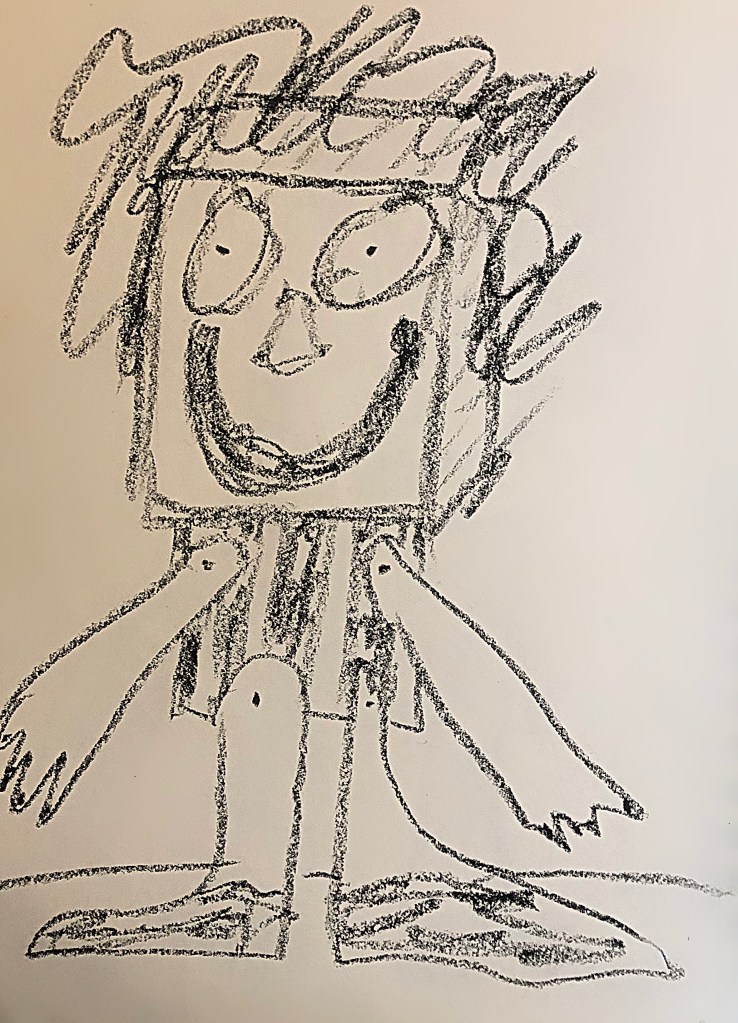 The first step was to draw the figure above; a prospect I did not relish doing. As I was in my usual overthinking vs just-do-it inner argument mode, I decided to give in and draw with some black and white pastels. Partially, because the teacher suggested we try to do more work in black and white, and partially because I just didn’t[t want to fuss with it too m much. Sooooo… I made a couple of line drawings and kept to the very child-like feel of the assemblage (that’s the silly figure you see above).