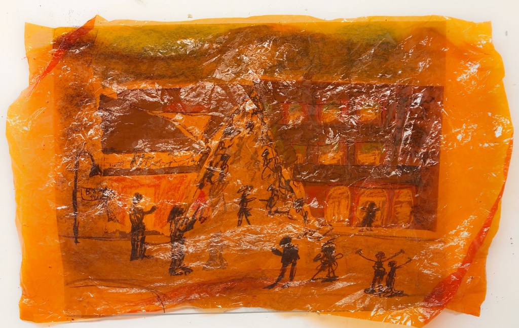 We only had an hour to make our artwork and I was pretty sure I couldn’t do a drawing I’d be happy with in that time, so I dove into other materials we always have around class. I used collage, charcoal, and coloured plastic to render the feeling of the street, as I see it in my mind’s eye.