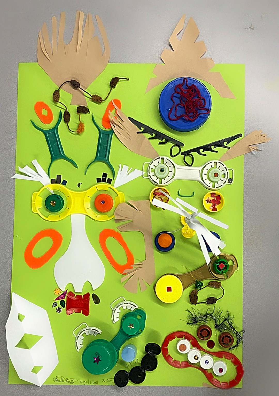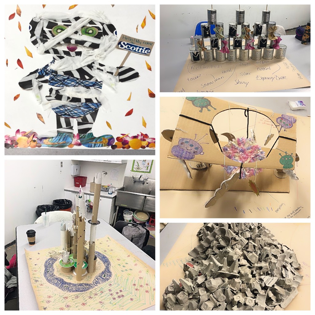 Imagine yourself walking into class, as usual having little to no idea of what surprise activity the teacher has in store. The tables are clear, except for a single large sheet of brown paper on each. Some of your classmates are already sitting at the tables with their bags and other art stuffs, so you don’t notice the large bag under the table full of recycling junk. You all settle in and the class begins.