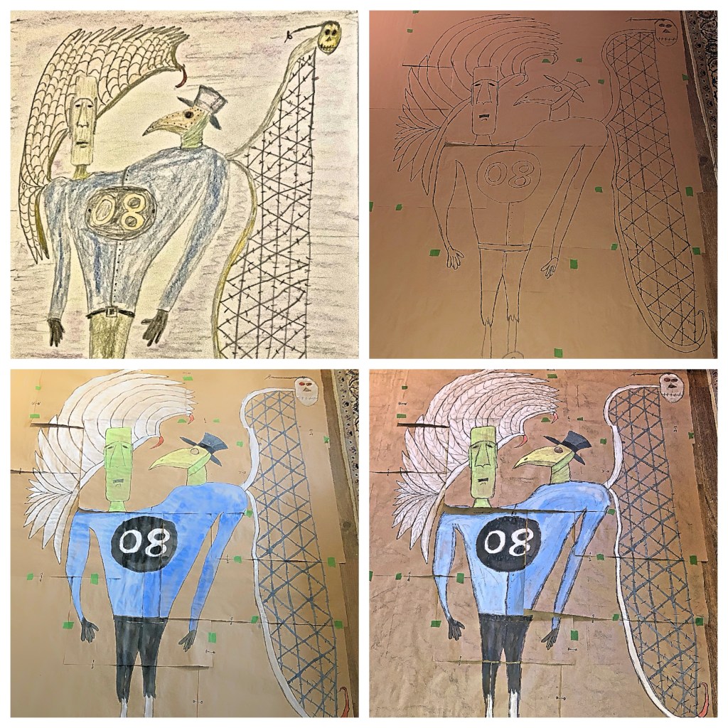 This guy stands over seven feet tall and four feet wide. I purposefully drew him on multiple pieces of craft paper to add to the Frankenstein feel of the composition. Started with a simple 2b pencil, then gouache and charcoal. It was an unholy mess to manage in my confined studio space, but loads of fun. When I re-assembled it in class for display, the lines no longer matched up and that added another layer of “shouldn’t be” monstrosity to it.