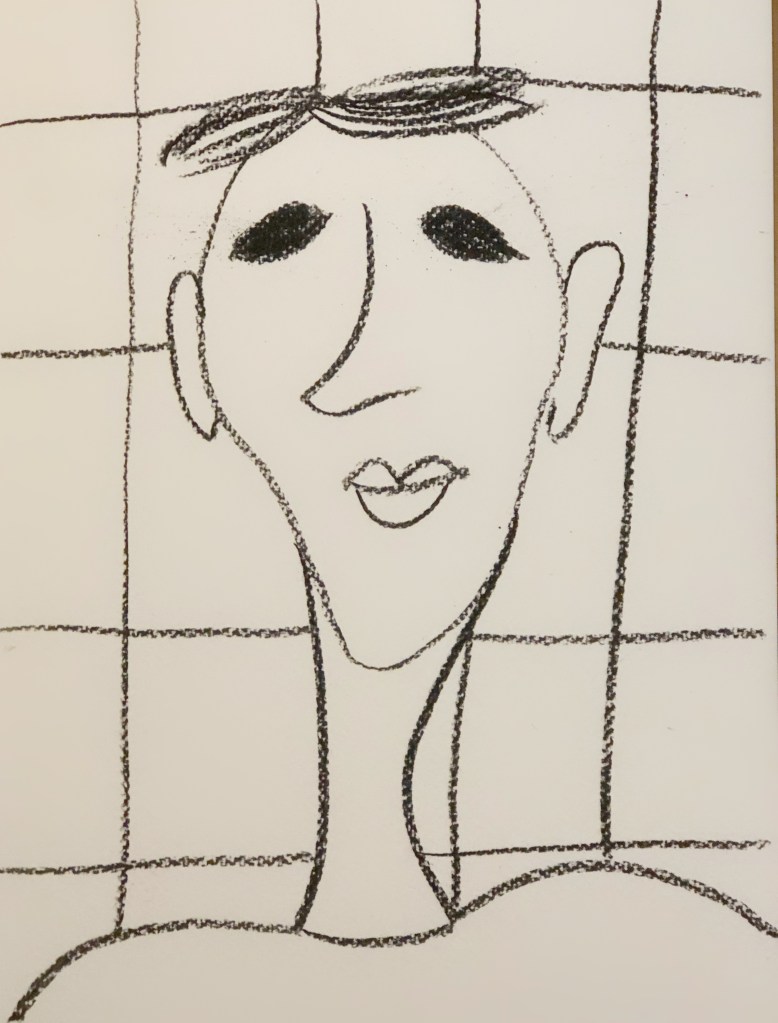 Show quick steps to Modigliani’s faces: Make a “U” in the middle of the page; make an upside down “U” above it; draw two almond shapes for eyes in the top part: draw an “L” for a nose: For the mouth, make an “m”, draw a line under it, then another curved line under that; draw two vertical lines for the neck; Make a big curved line for the shoulders; Modigliani liked to have backgrounds, so make grid lines…