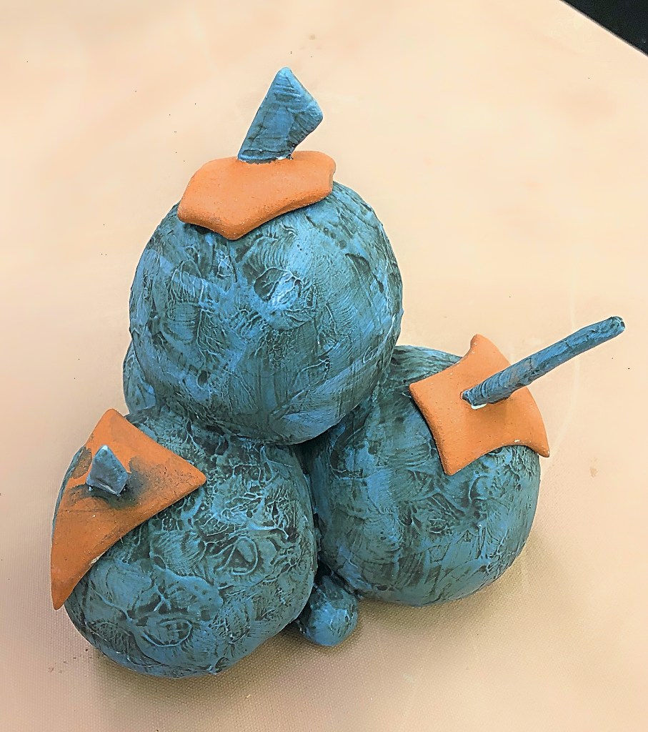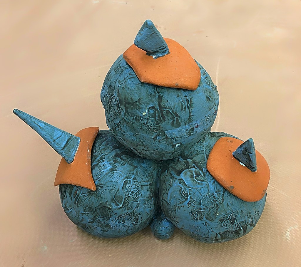 So, I’ve made a pyramid of four pinch-pot spheres, attached with slip: heavily coated with blue engobe; made the lids with slab scraps; left it all to dry slowly to leather hard, before cutting openings under the lids; added lips under the lids, so they wouldn’t slide off the spheres; let dry slowly to bone dry and bisqued; used cobalt blue oxide to stain; glaze fired in electric kiln to Cone 04.