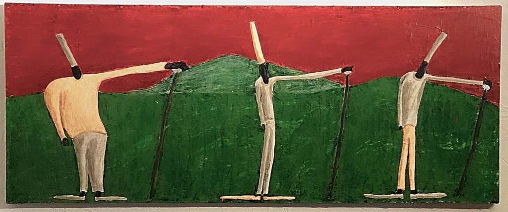 The first People painting was a horizontal affair measuring some 48″ (122cm) x 24″ (61cm). I used a pallet knife and build the surface with heavy coats of paint, interspersed with glazings. I kept modifying the hues, until I felt this was right. The figures have no varnish on them, the sky has a thin matte varnish and the rest is coated with many layers of glossy varnish. Always using a pallet knife for the large surfaces and a brush for the smaller ones.