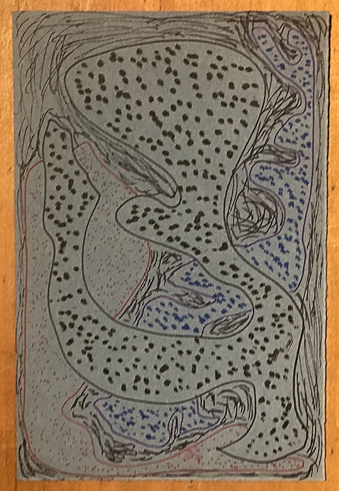 I forgot to mention that one of the categories prompted by our drawing teacher was doodles. Doodles? That could be anything! Too many possibilities and choices for me. So, I reverted to some amorphous shapes, loosely ornamented with dots. I think there are 2 like this one.