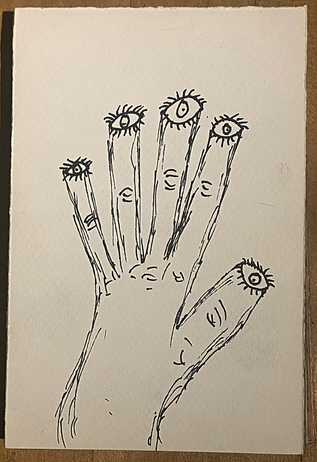 This is for the parents out there. How many times have you heard yourself repeat a saying from your parents? The one that comes to mind when looking at this odd drawing is “we look with our eyes, not our fingers”. Well, what if you had eyes on your fingers? What would you say then?