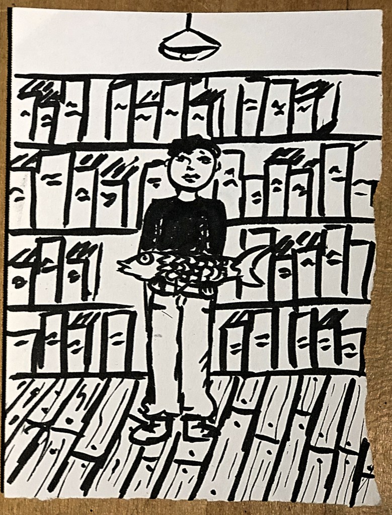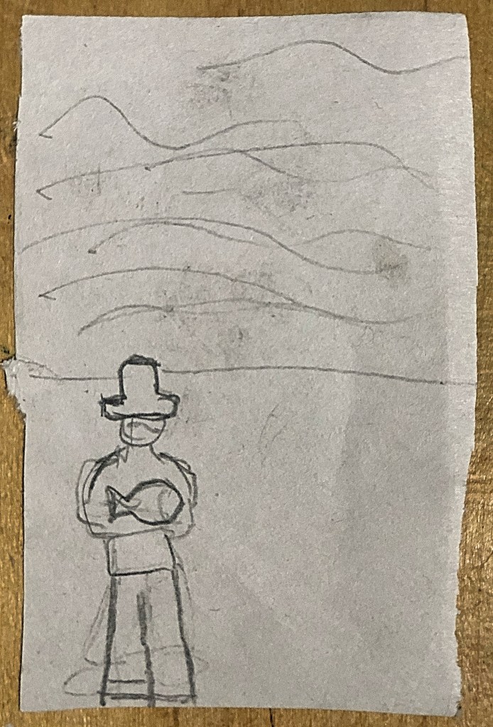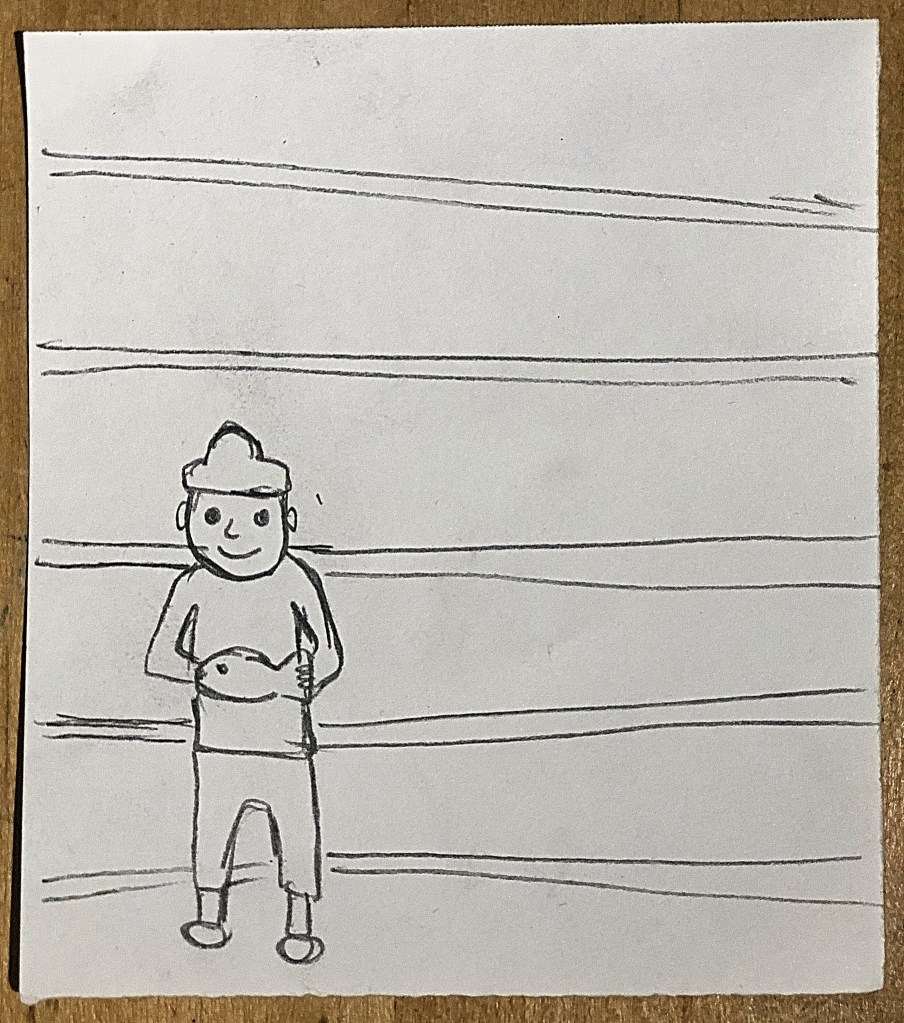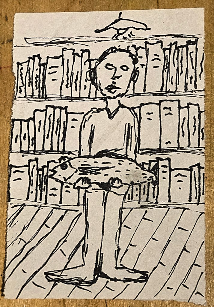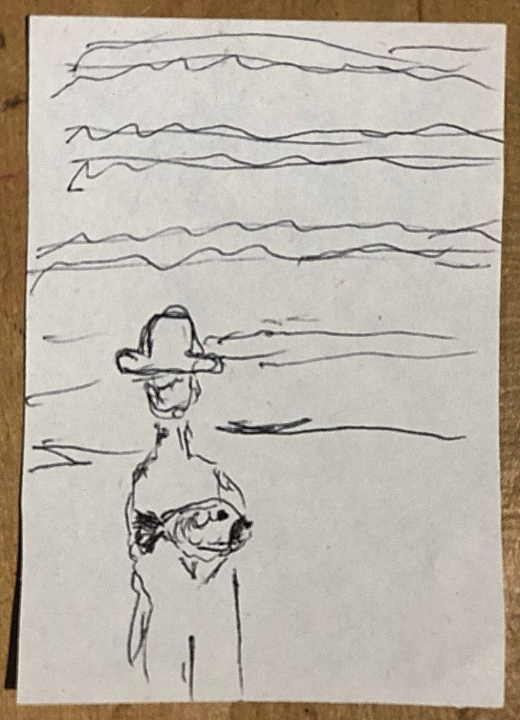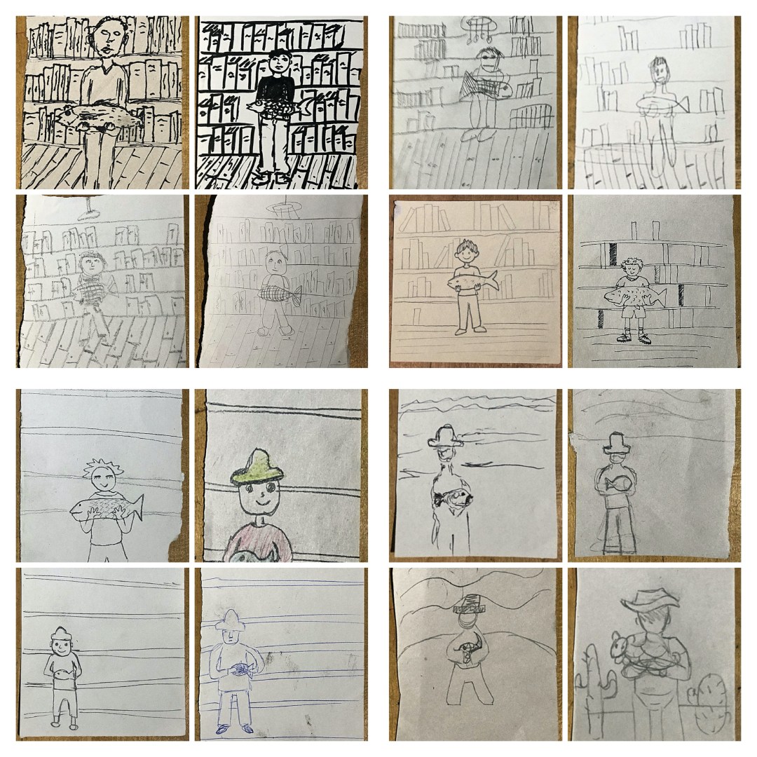 Well, imagine trying to do this with drawing. Each of us (we are 16 students in total) was to draw a simple sketch on a small piece of paper. The sketch was to show a figure interacting with an animal or thing, in a space. Once drawn, we were to turn it over and write our name and #1 on the back, then hand it to the person on our left.