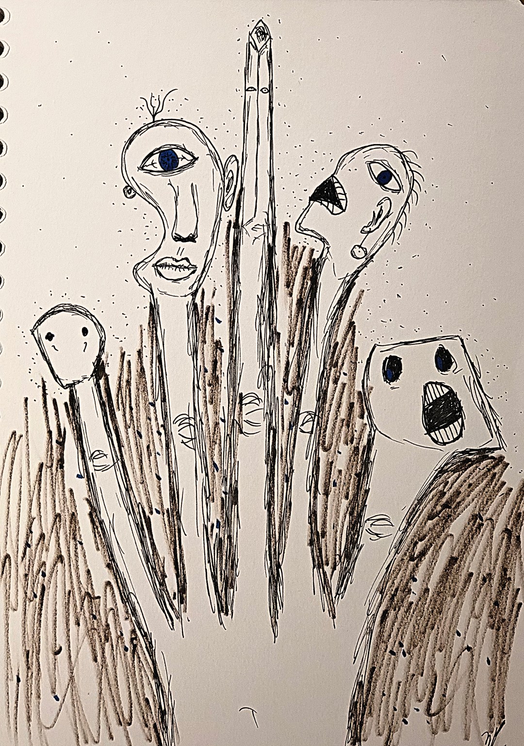 This one is closer to nightmare than humorous meme… somewhere in my unconscious are demons with eyes in the palms of their hands. The odd faces are now growing from the fingers and this too, I now realize, comes from one of the Nightmare on Elm Street films. I didn’t have the right colours, but the background are meant to be flames.