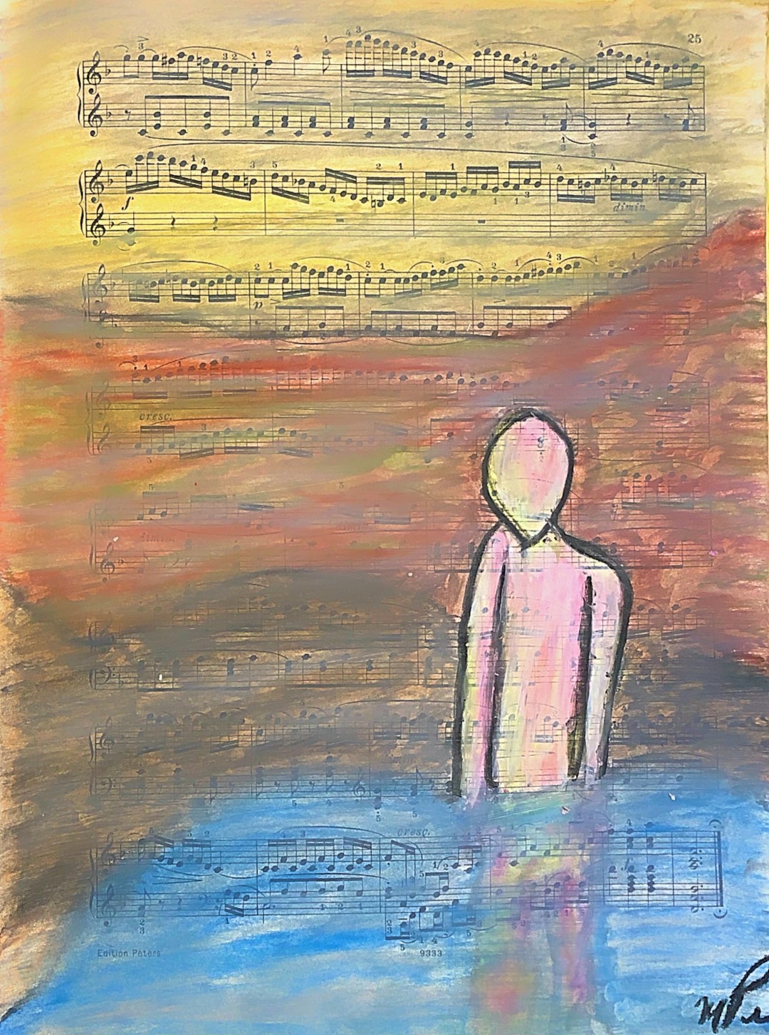 The ball has only been a reminder of how unloved this figure feels. They yearn to be free of all their pains. The leave The Death Dance, disrobe, and enter the pond in the dead of night. Lights fill their world, in their mind’s eye and they contemplate release. They take one final breath and prepare to dive below the waterline, into bliss… oblivion.