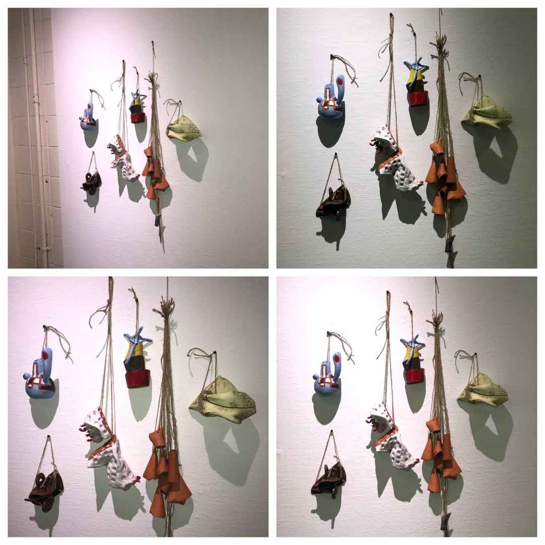 The project challenge was to make abstract forms, defines as not resembling anything. The secondary challenges were that they must be hung on a wall, possibly incorporate other materials, potential tally be made with a variety of techniques (coils, slabs, pinch-pots, etc..) and finished with different glazes, engines, and terra sigillata.