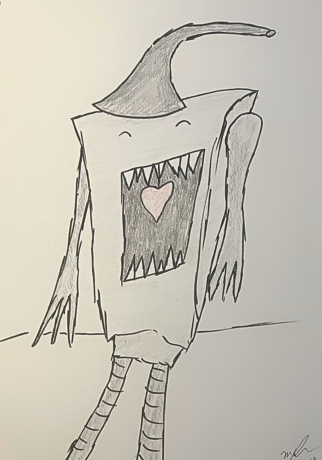 While barely recognizable as a robot, I chose to continue some features I’ve done earlier. Such as the open chest cavity and the visible heart. Only this time, the heart seems to be floating just out of reach of the teeth. The line from which it hangs is over the sharp teeth, not behind it. The strange hat is the only other real nod to the Tin Man, except, perhaps the extendable-metallic looking legs. Maybe this Tin Man is the bad guy that never changes to good. What do you think?