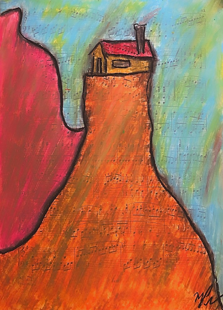 I’ve started teetering over the edge of boredom and the need to do something is growing into a near frenzy! With dozens of pages left to fill from the music sheets, chosen for these pastel drawings… well, here are a few more… staying with the fantasy of being able to live with quiet, if I was isolated from all others around me, these little houses are built for comfort and serenity. The worlds they inhabit are full of colour and joy. Even in darkness, they have light. Such is the fantasy of isolation I imagine…