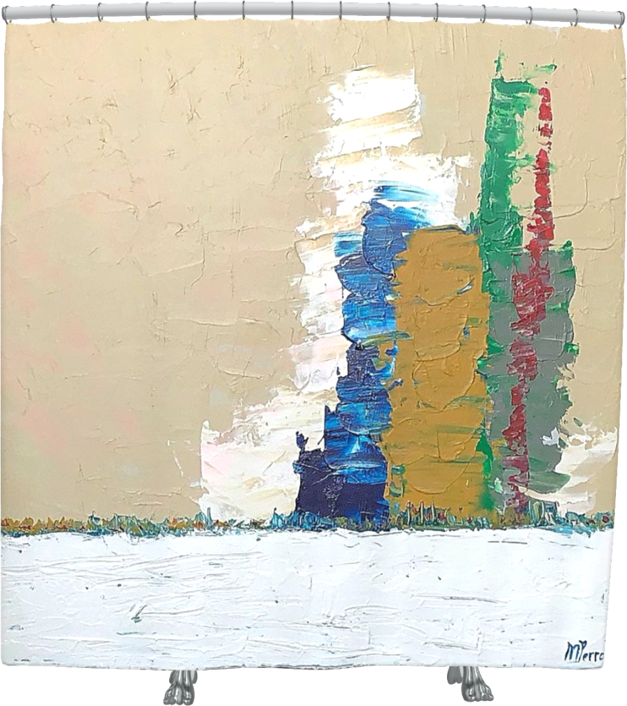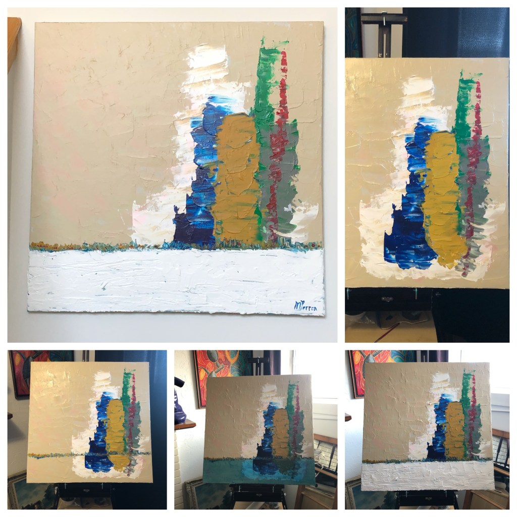 I dreamt of a floating forest, displaying the basic colours one might find in a sun-dappled wood. This morphed as my dreaming mind tried to tell a story for it and it became floating mountains… some part from Lovecraftian dreamscapes, some part from Miyazaki’s moving and floating architectures. I enjoyed the mass floating off to one side and dragging me and my fellow viewers off the side of the canvas, but the composition still felt stagnant… until I added the horizon line. I was getting closer, but leaving the massive rocks reflecting in a lake didn’t bring the movement I felt in my vision. When I scratched up an abstract treeline, I gave the rocks the size they deserved. When I added in the snowy field in front, the sky lightened and build a greater contrast between it and the floating rocks. They became unmoored from the ground and started to appear like the travelling structures I dreamt of.
