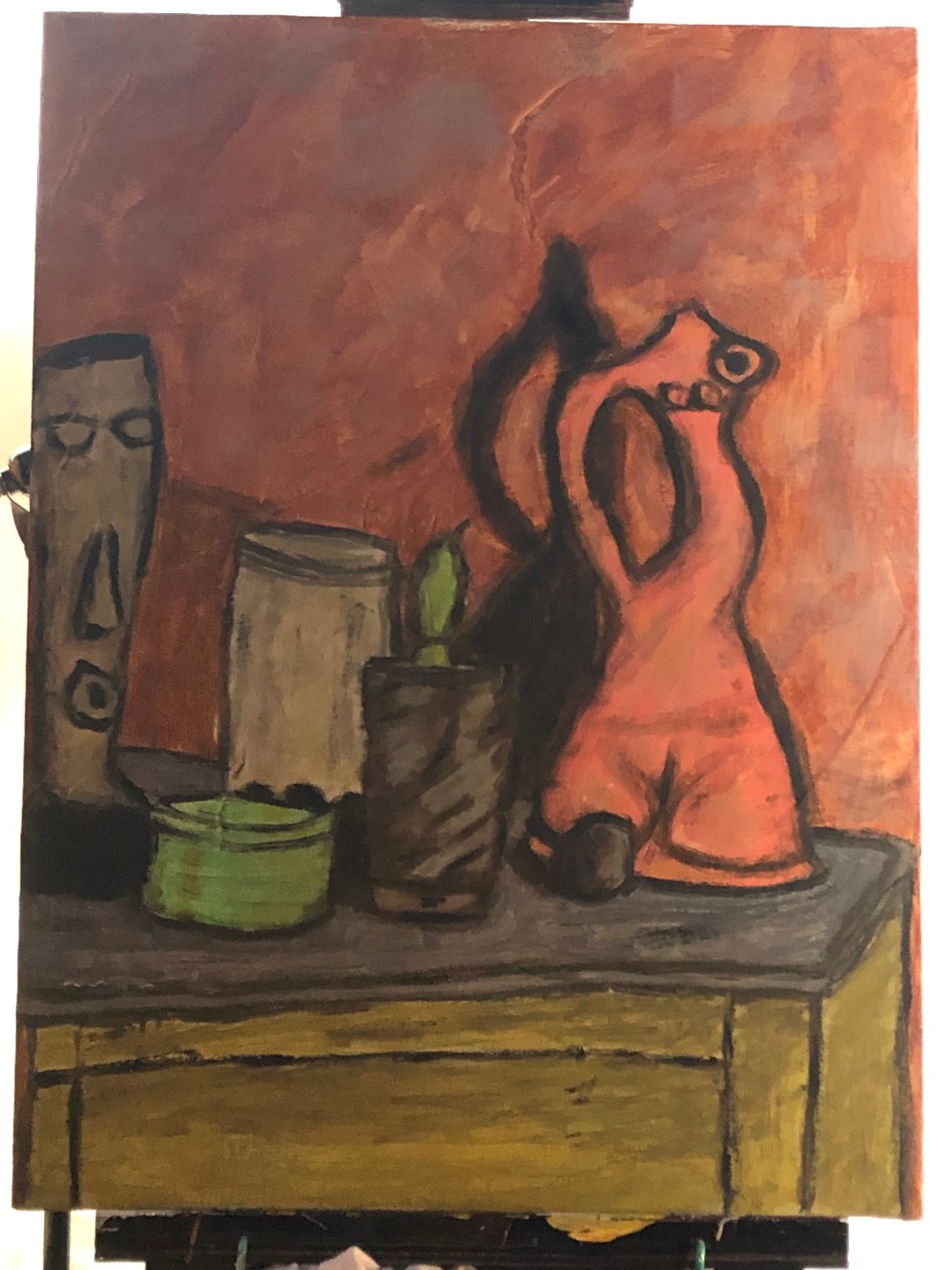I’m painting in a dark space with no direct light on my work, only on the objects I’m painting. The shadows are all over the room, blocking my point of view and forcing me to rely on instinct and muscle memory. In the past, this would frustrate me terribly, but now, I’m not invested in the end result of this piece… it’s a learning experience and the process is what I’m allowing to develop.