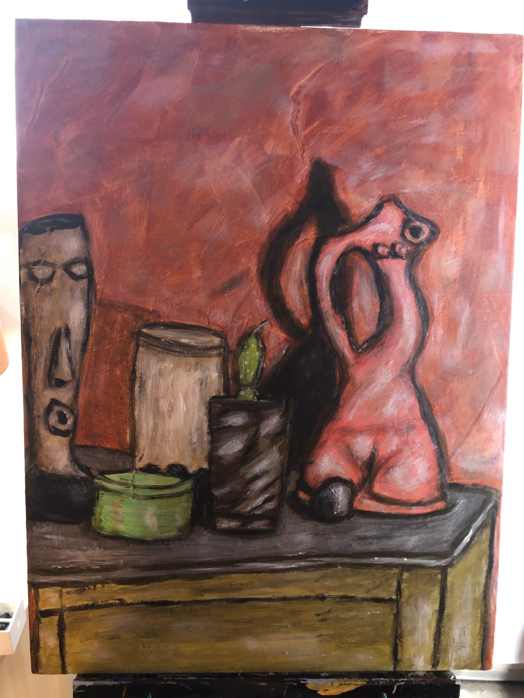 I’ve added the highlighting with titanium white and a fan-brush… watering it down to allow me to build up layers… while doing it I was reflecting on the question of confidence… do I have more confidence using oils? I think I might, because I use more paint on my brushes when using oils. With acrylics, I feel I can build up and overpaint mistakes more easily. Hmmm… I’ll have to test this theory out this semester…