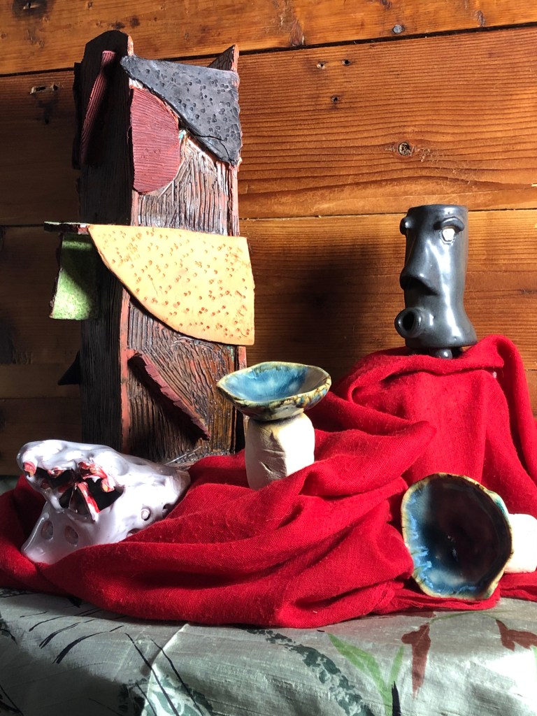 Almost three hours of fiddling about with different pieces of sculpture and materials, I finally came up with this composition, but I’m still not sure, so I decided to do a little photo-editing to see how I feel about it…