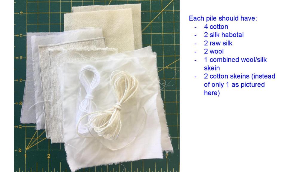 1- Mordanted in Alum, we have: Two 11″ x 11″ piece of cotton; One 11″ x 22″ piece of cotton; One 10″ x 40″ piece of cotton; One 16″ x 9″ piece of raw silk; One 16″ x 9″ piece of silk habotai; & a complete sample pack from the first assignment. All mordanted in different solutions: Alum, Soy milk, & Sumac, or no mordant at all.