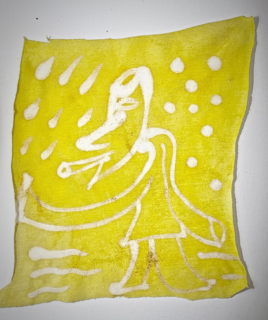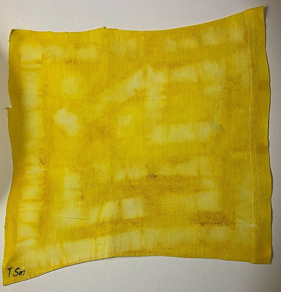 The cotton is soaked in a cool turmeric dye bath. The raw silk was soaked in an acidic food colouring bath. (Made from watering down a direct application colour paste: alum, guar gum, vinegar, & food colouring)